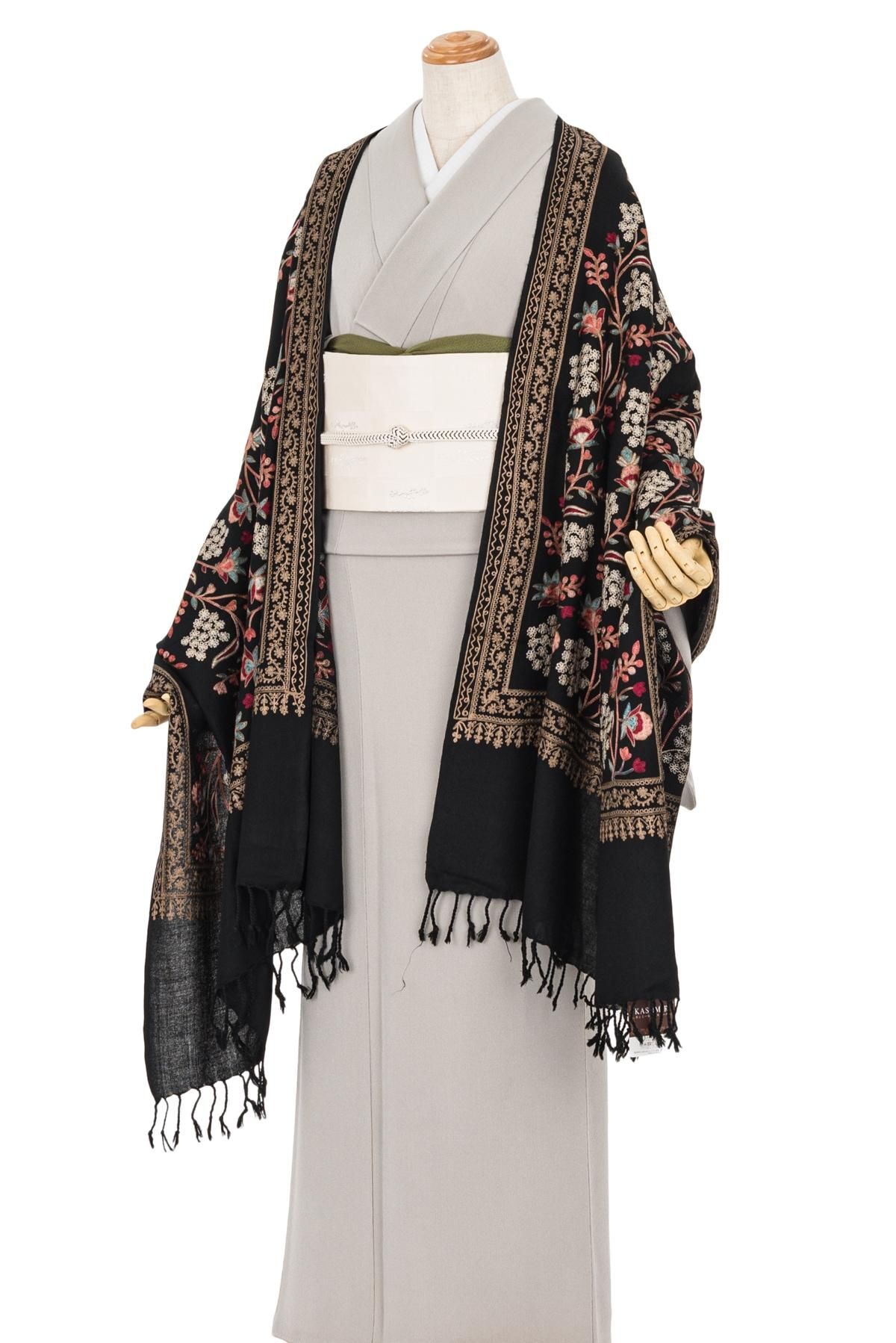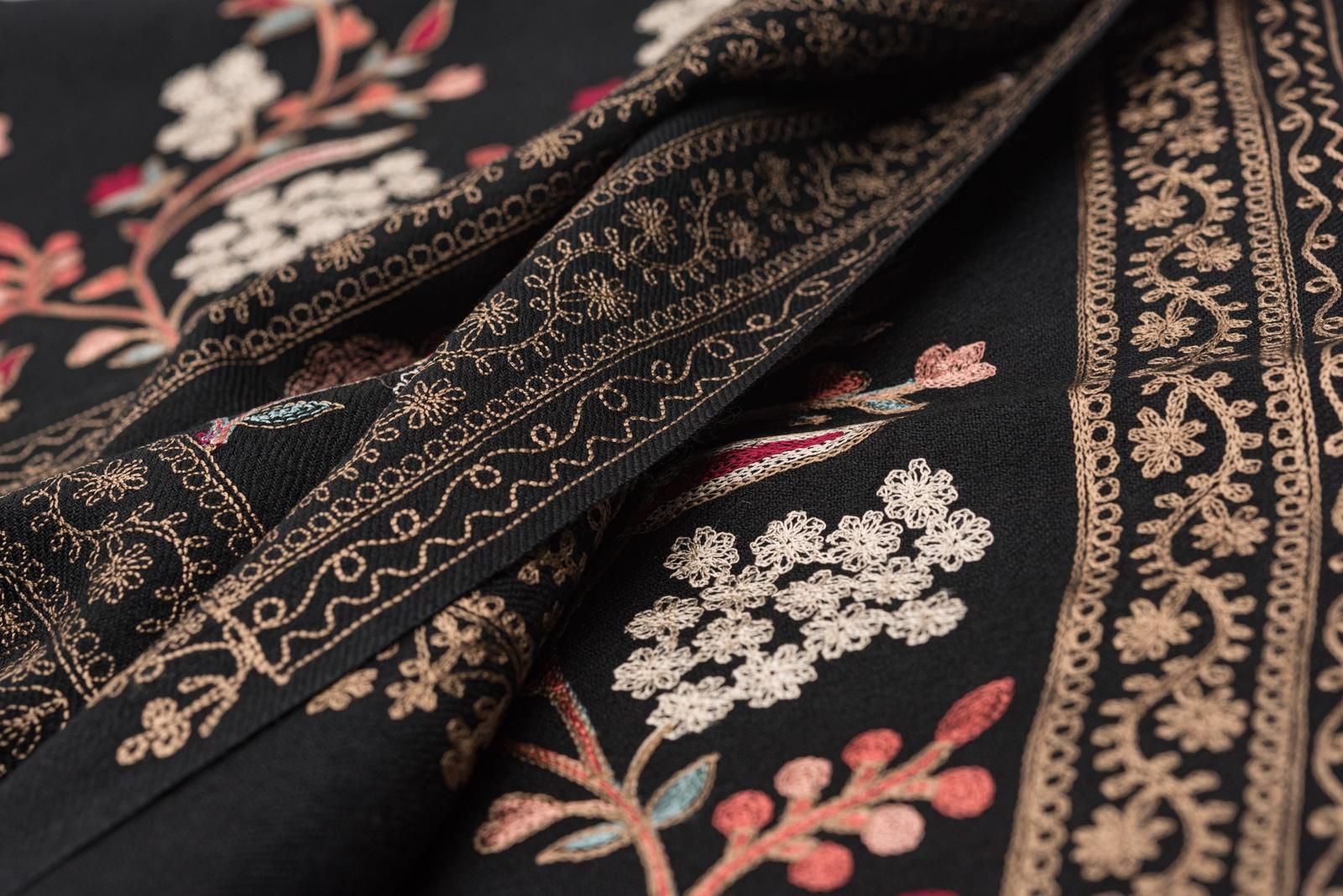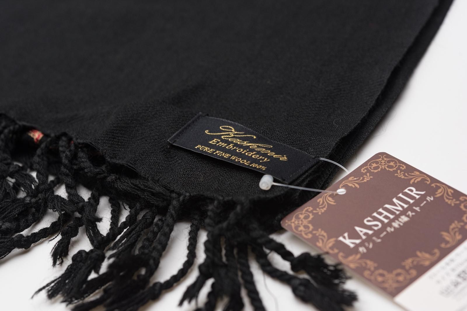 ウール100%大判ショール カシミール刺繍 黒