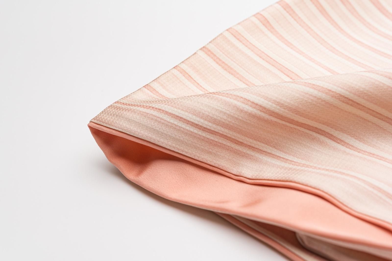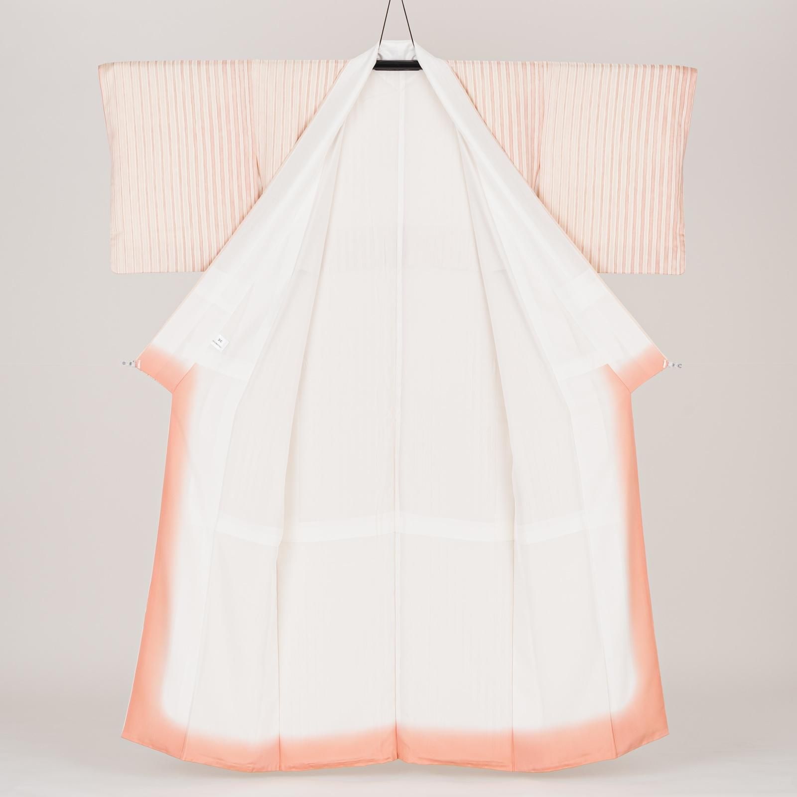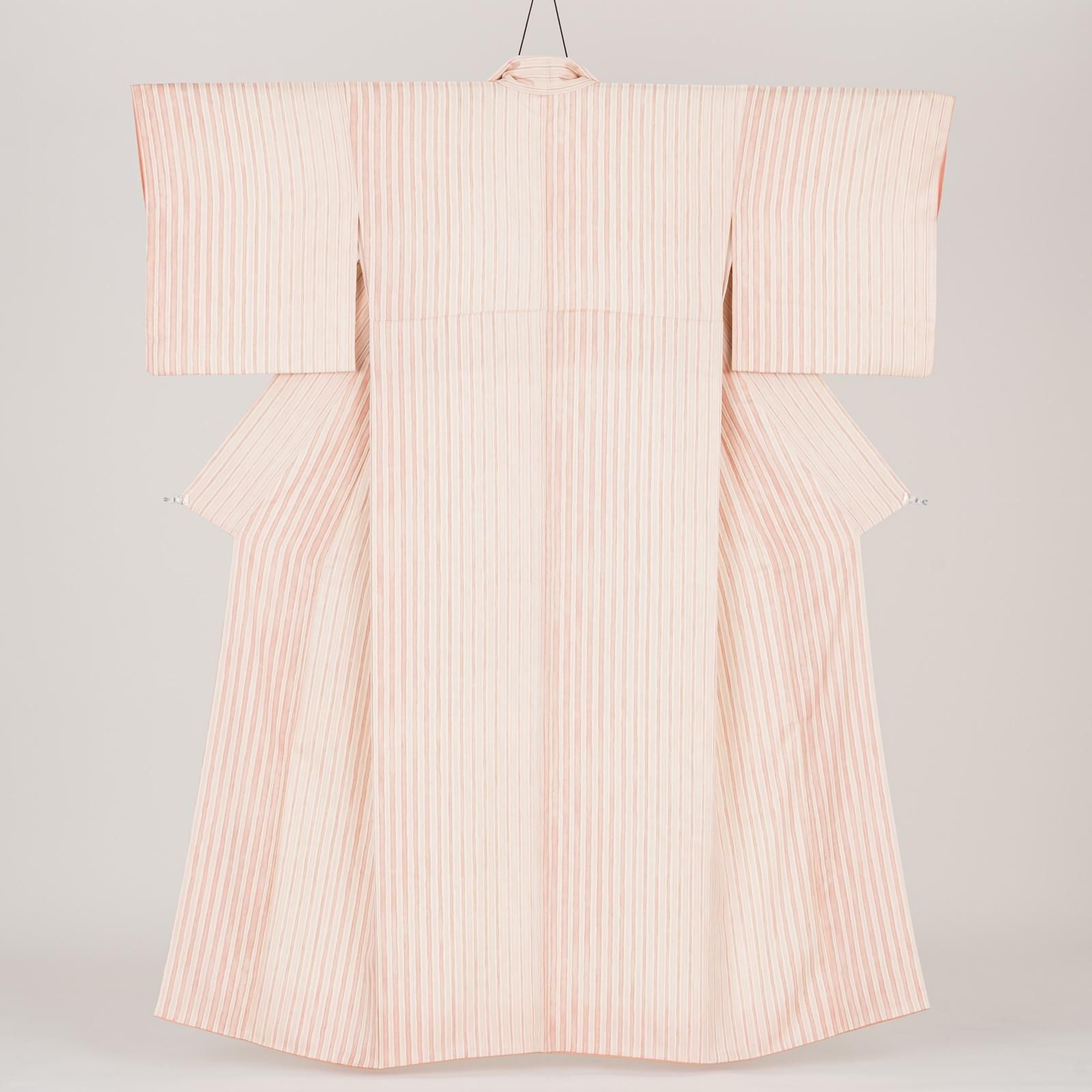 コーラルピンクと白を基調とした縞模様の小紋です。