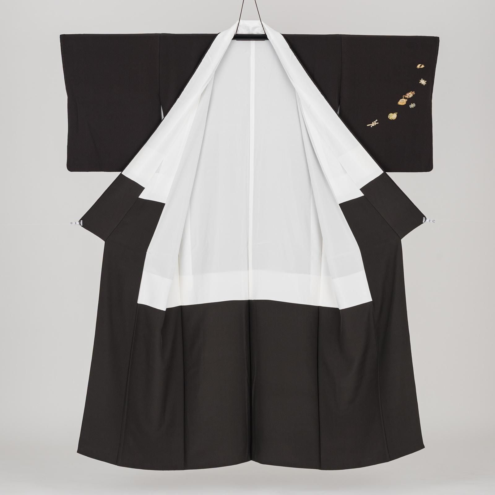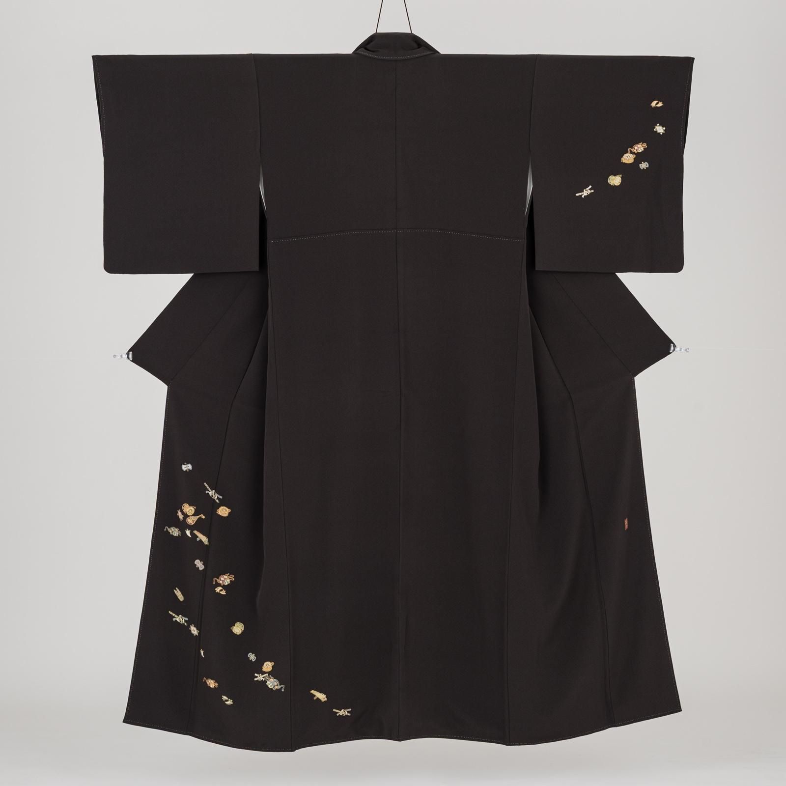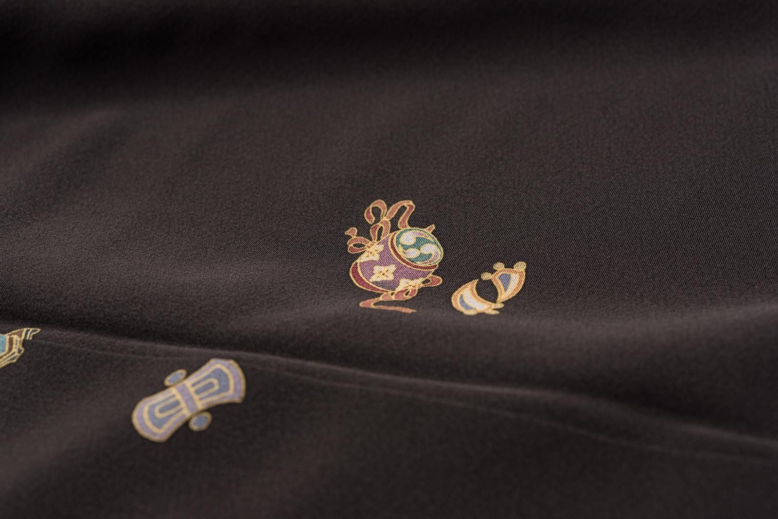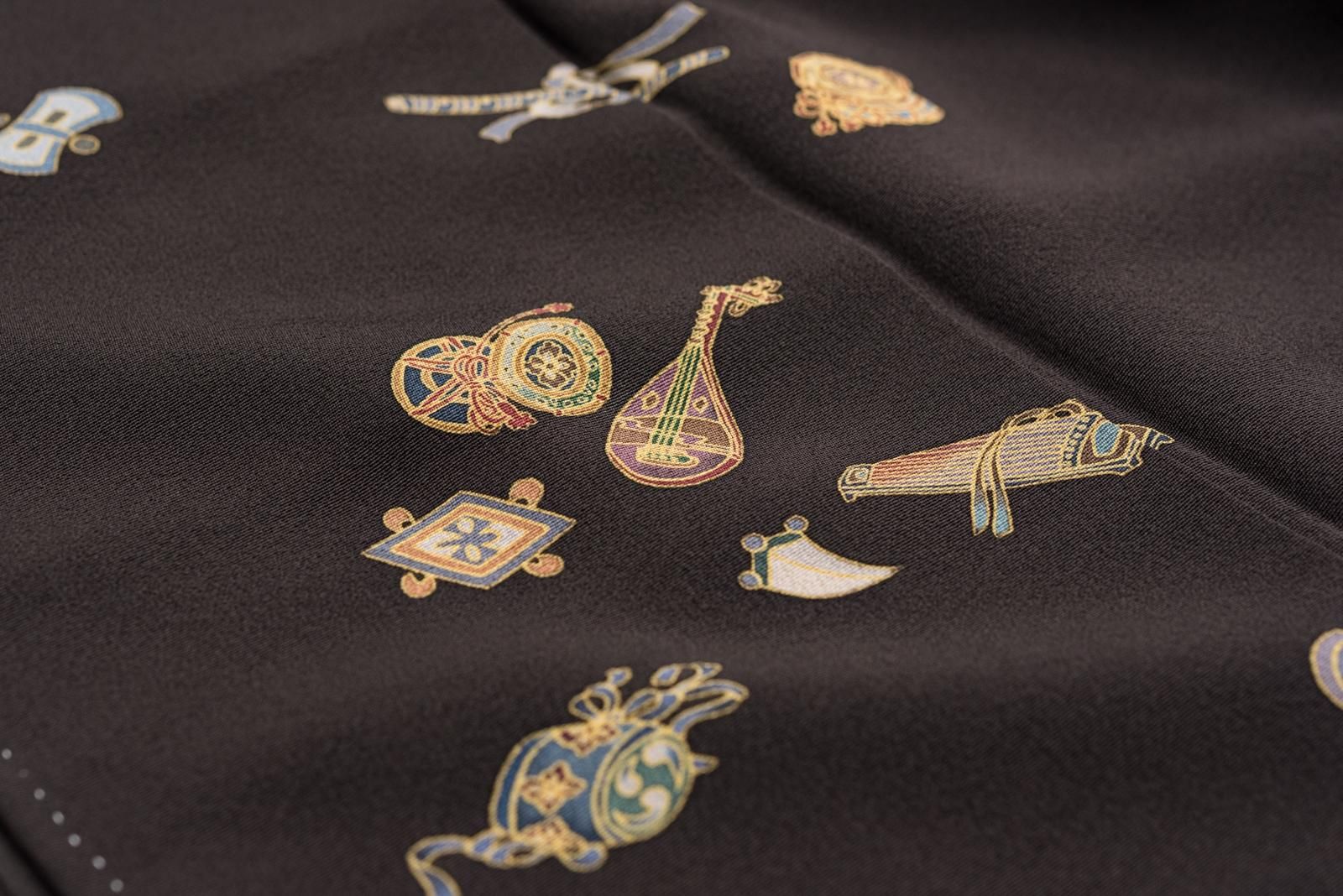 黒鳶色の地に描いたのは和楽器や宝尽くしの文様。