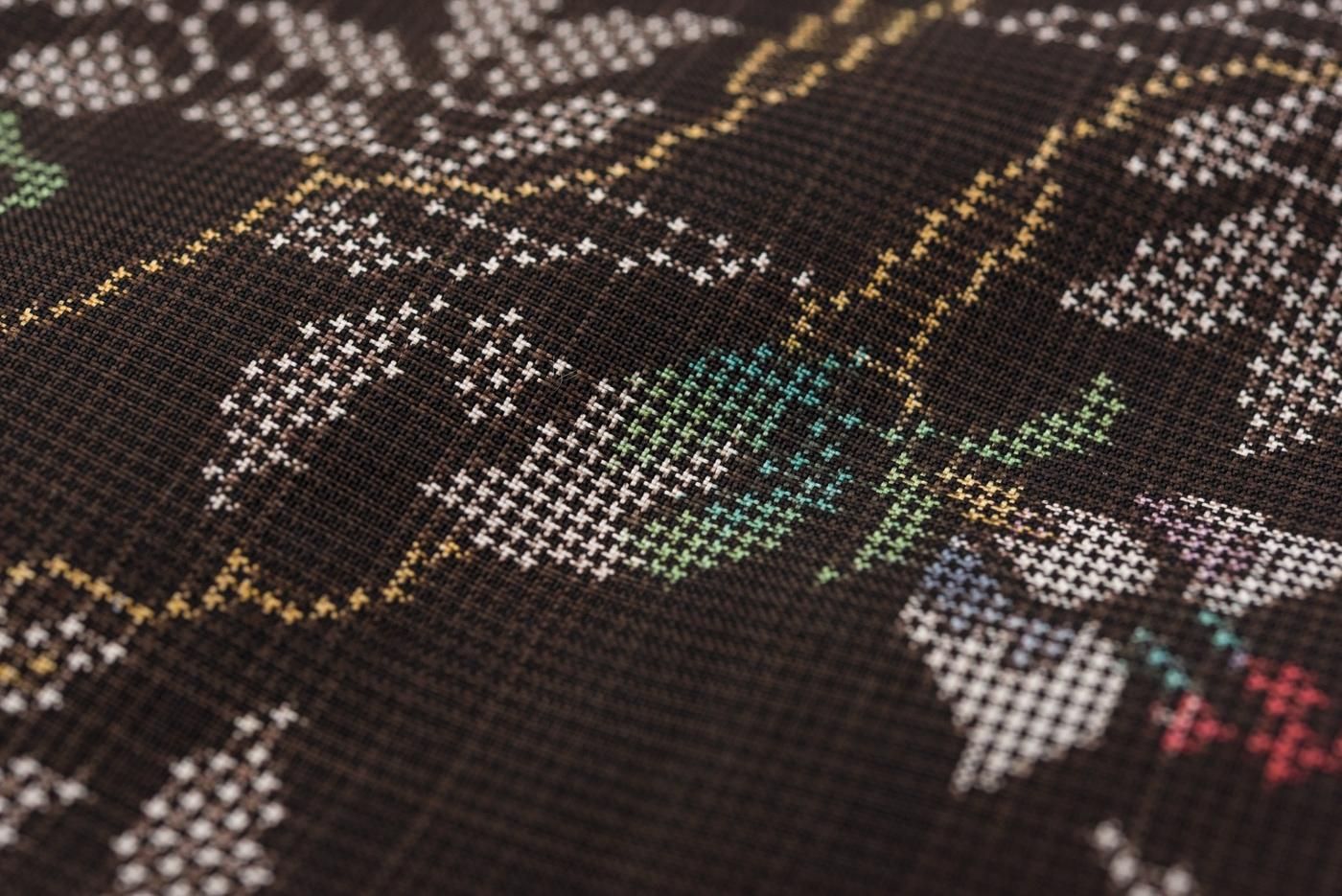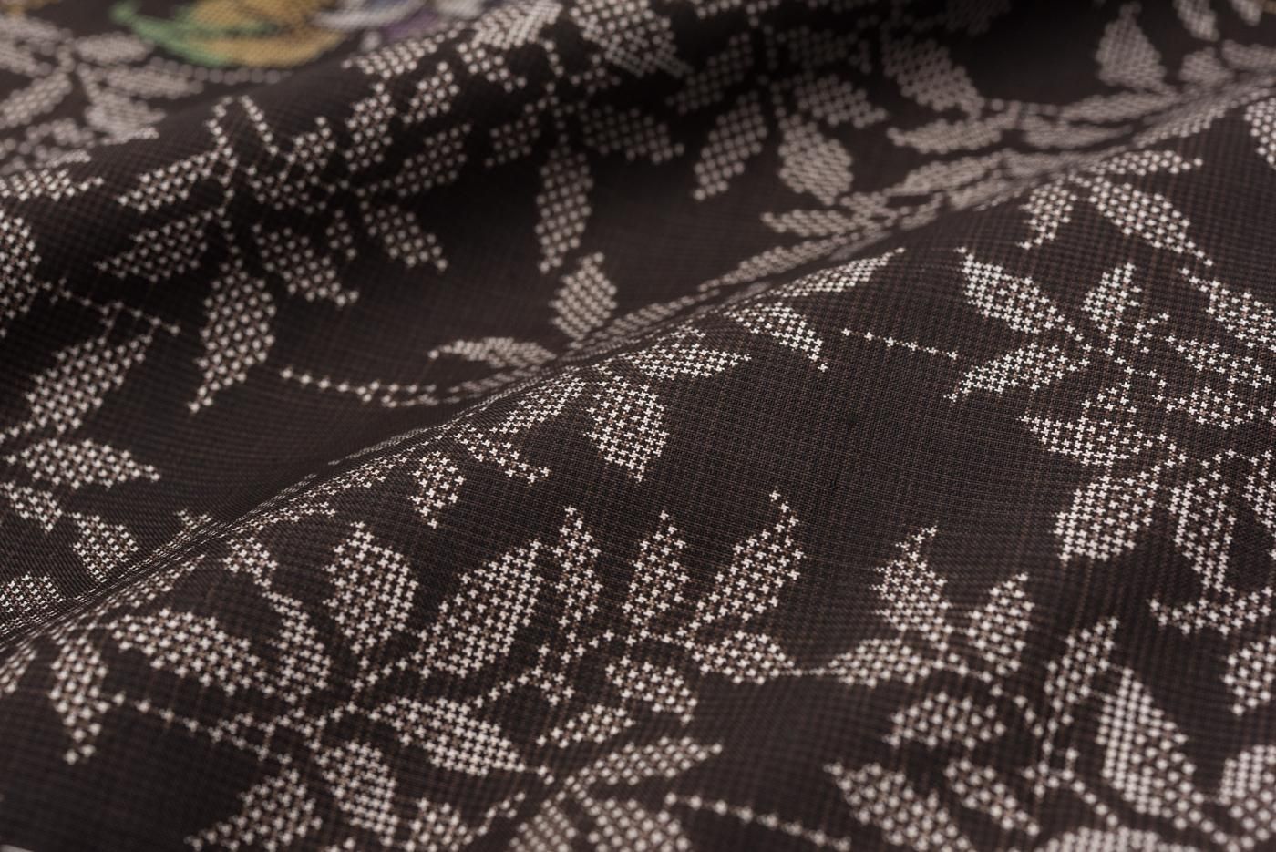 泥染めのやや茶がかった黒地に色とりどりの花びらが良く映えます。