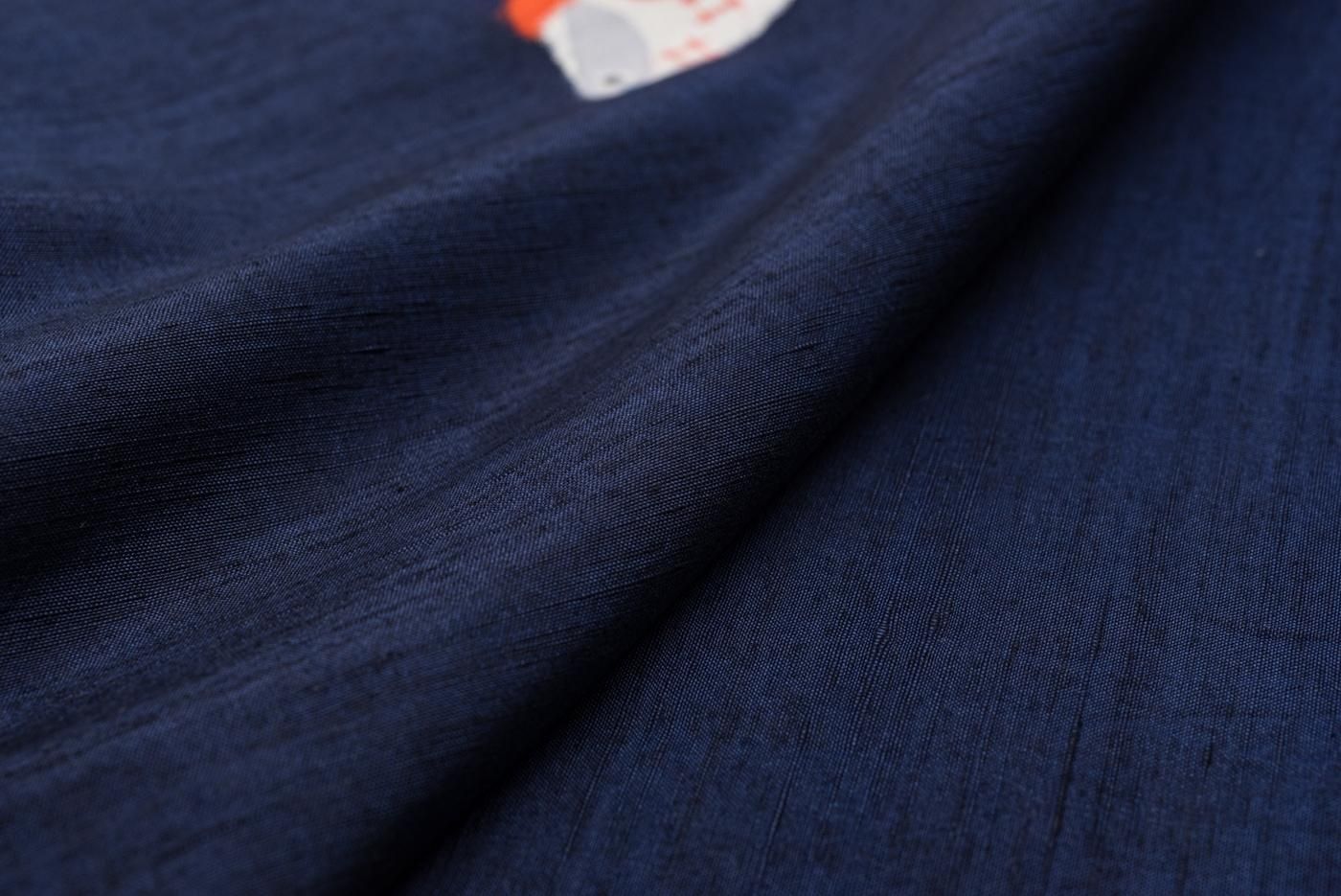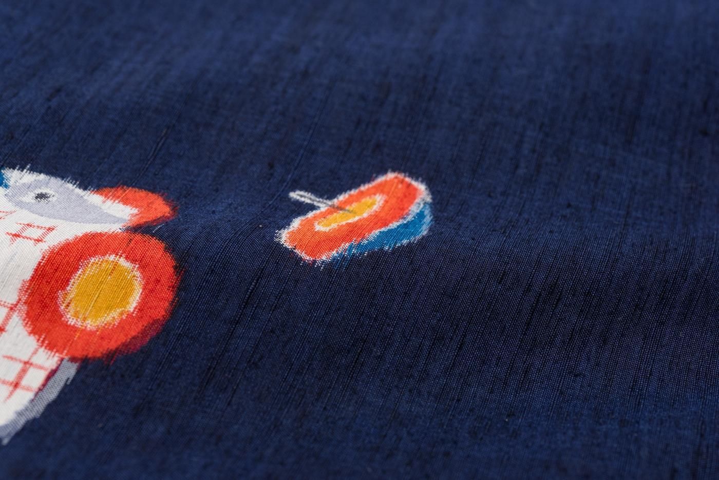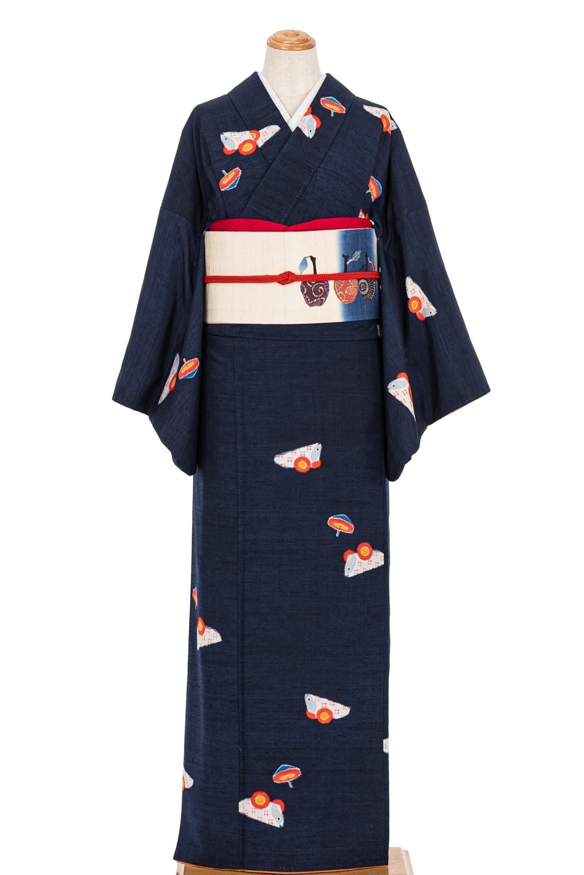 デニムのような紺地に玩具模様を織り出した紬の着物です。