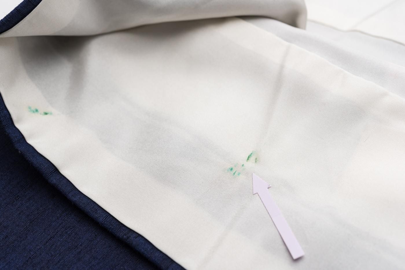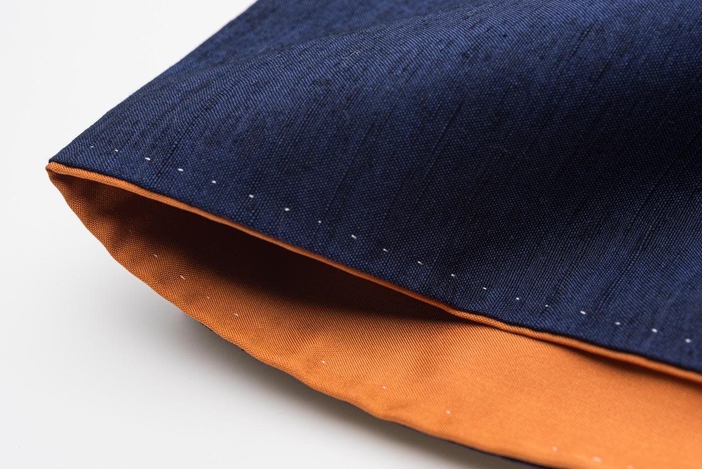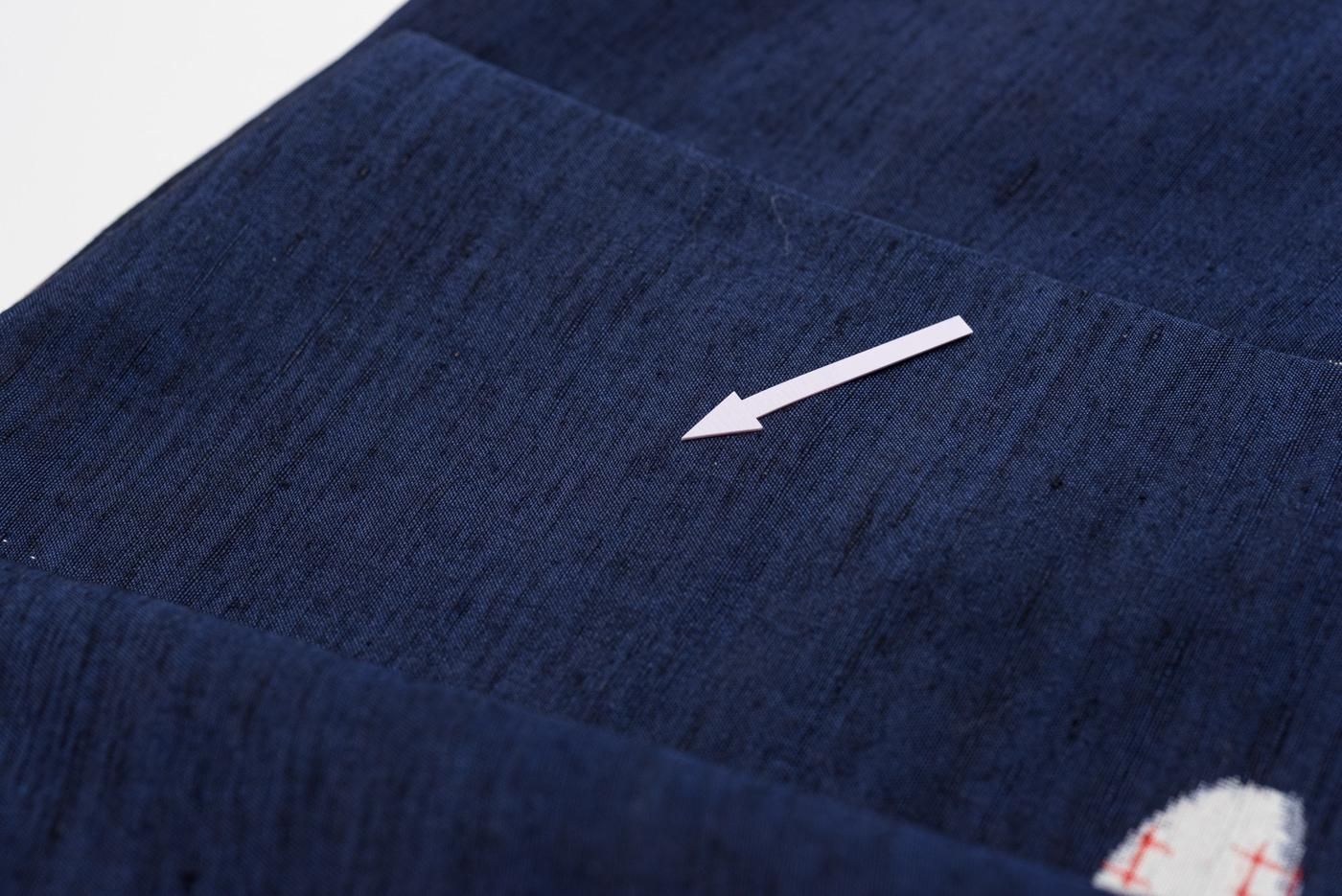 デニムのような紺地に玩具模様を織り出した紬の着物です。