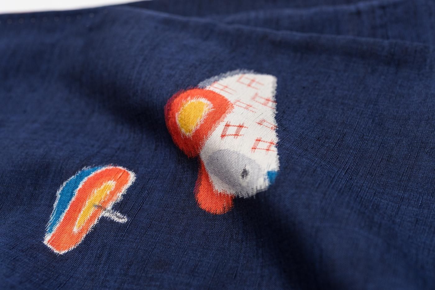 ほっこりとした真綿地にカラフルな玩具の模様が似合うレトロで愛らしいデザインです。