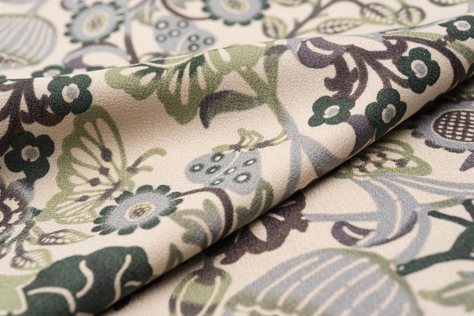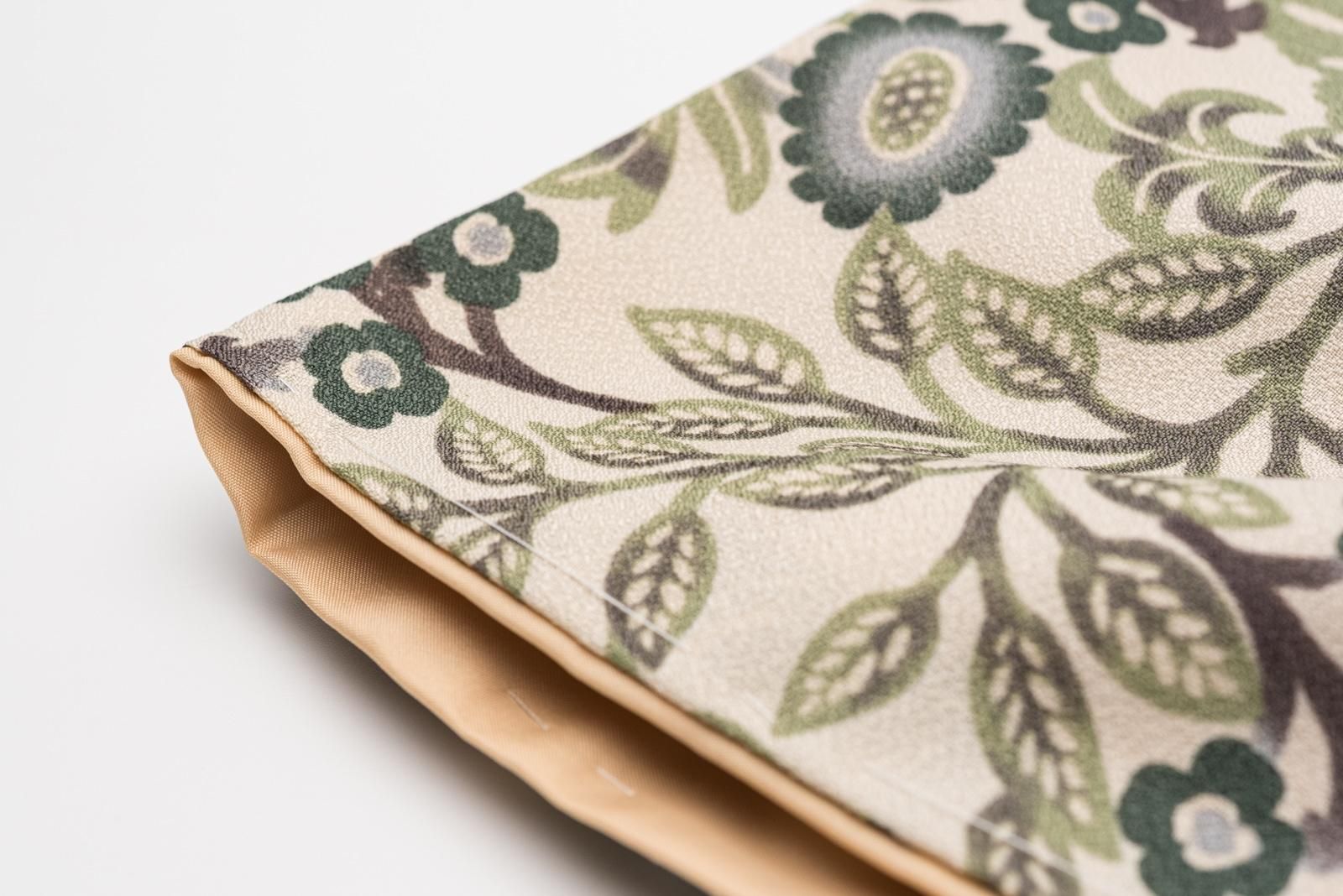 淡いくすみベージュ地に花と小鳥と蝶を染めた小紋です。