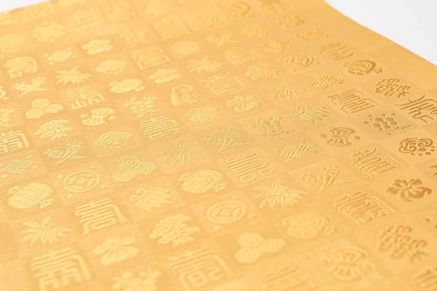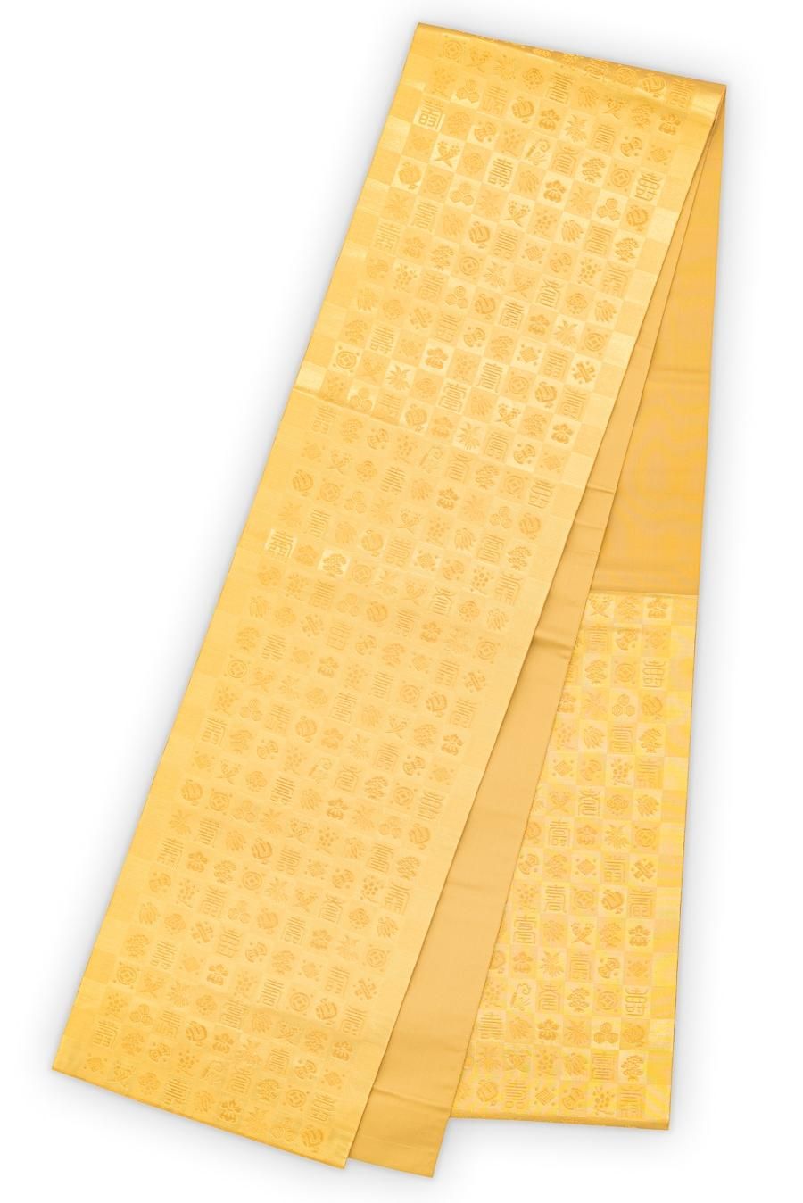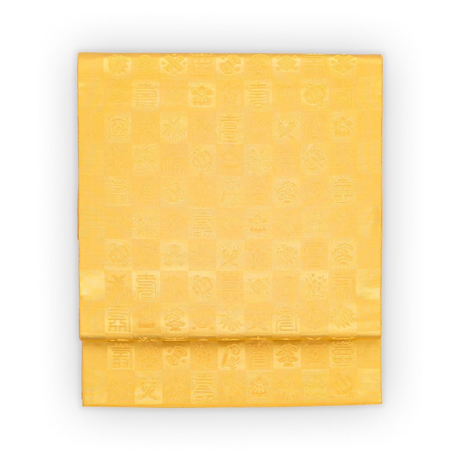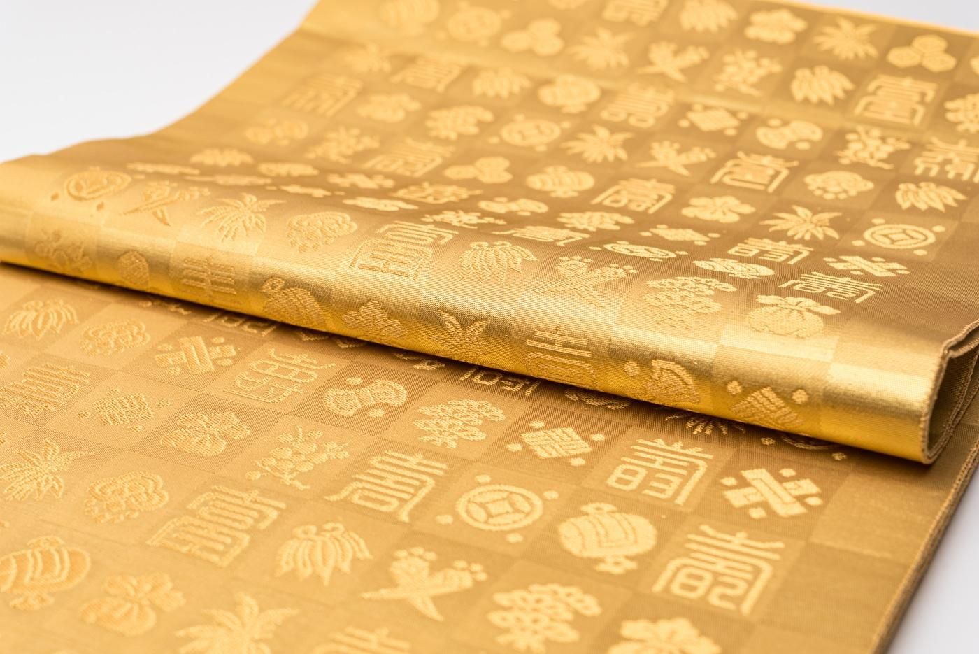 市松に寿の文字と宝尽くしの文様を織り出した袋帯です。