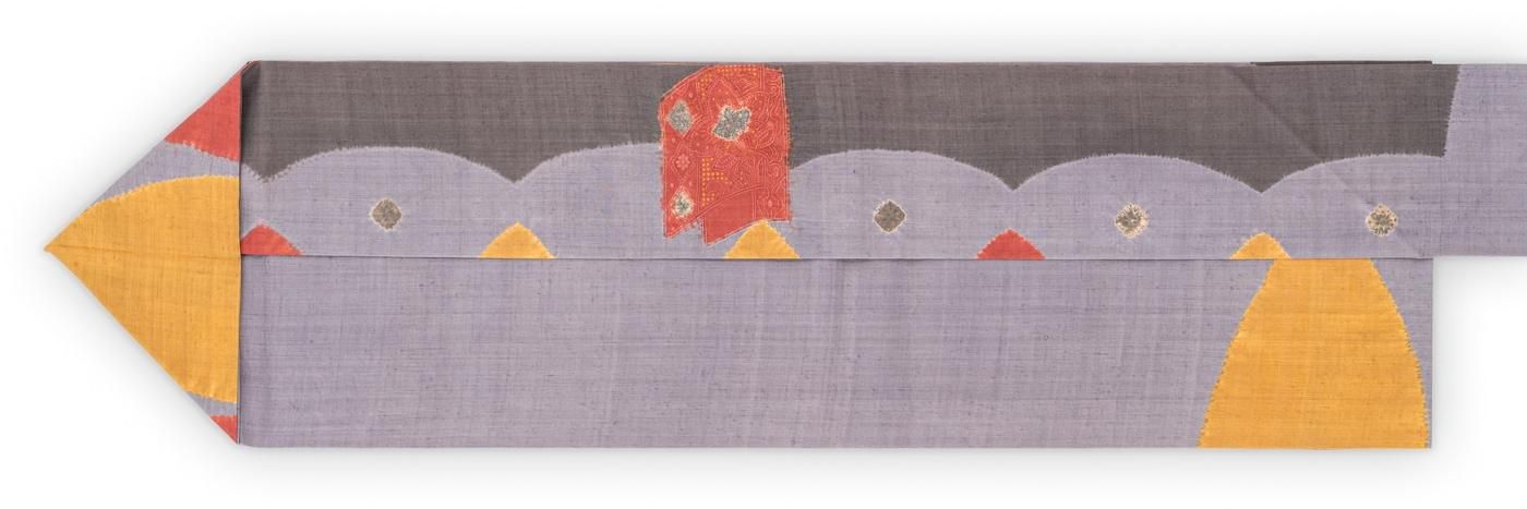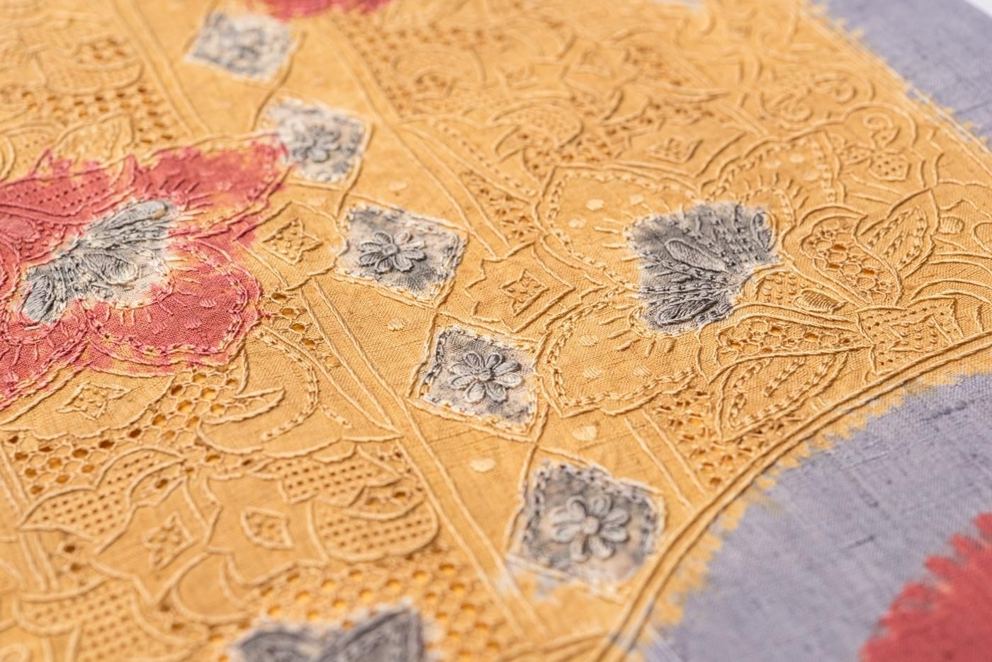 読本のようなシルエットに唐花模様が浮かぶ汕頭蘇州刺繍の九寸名古屋帯です。