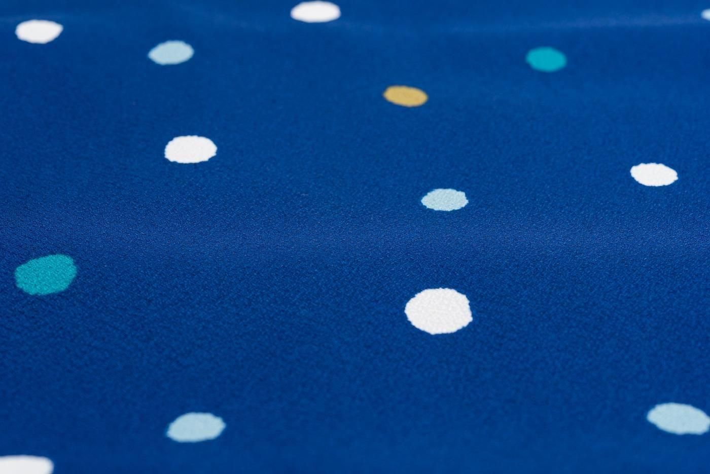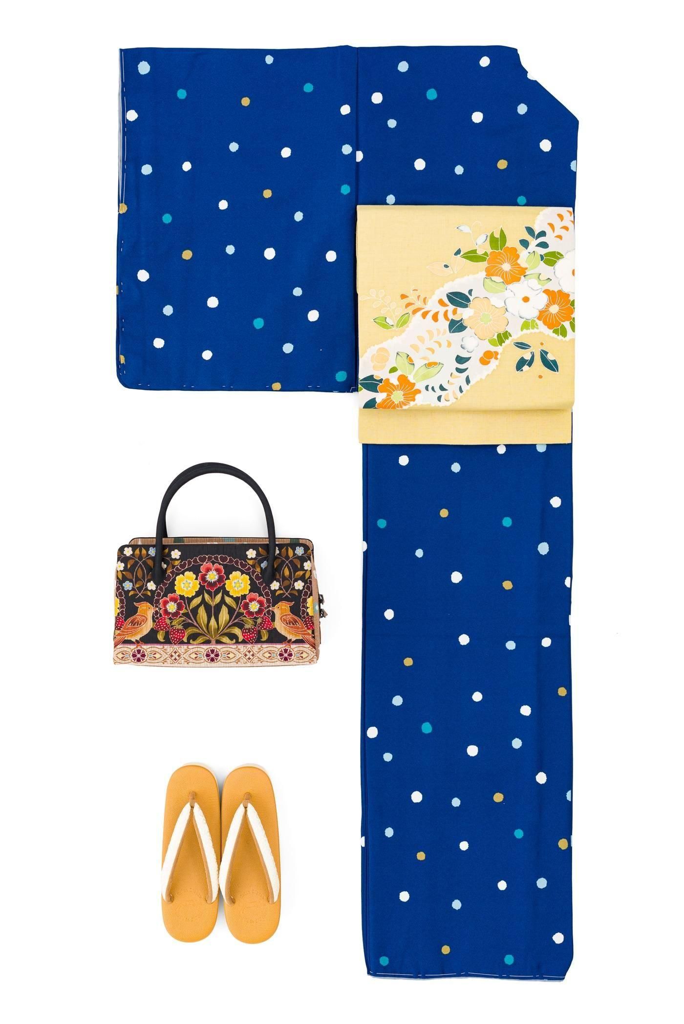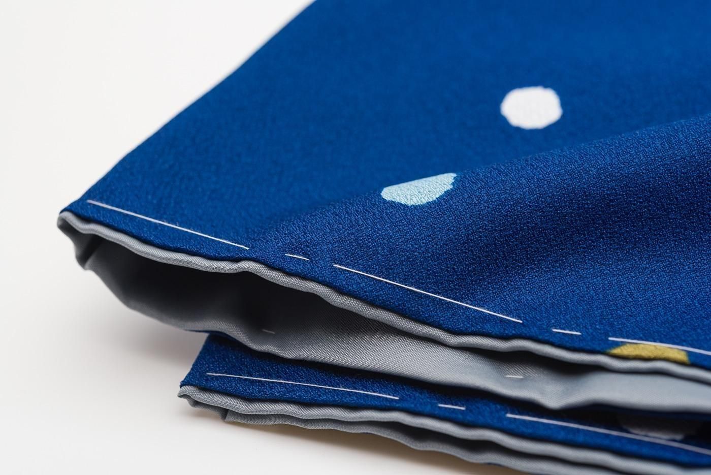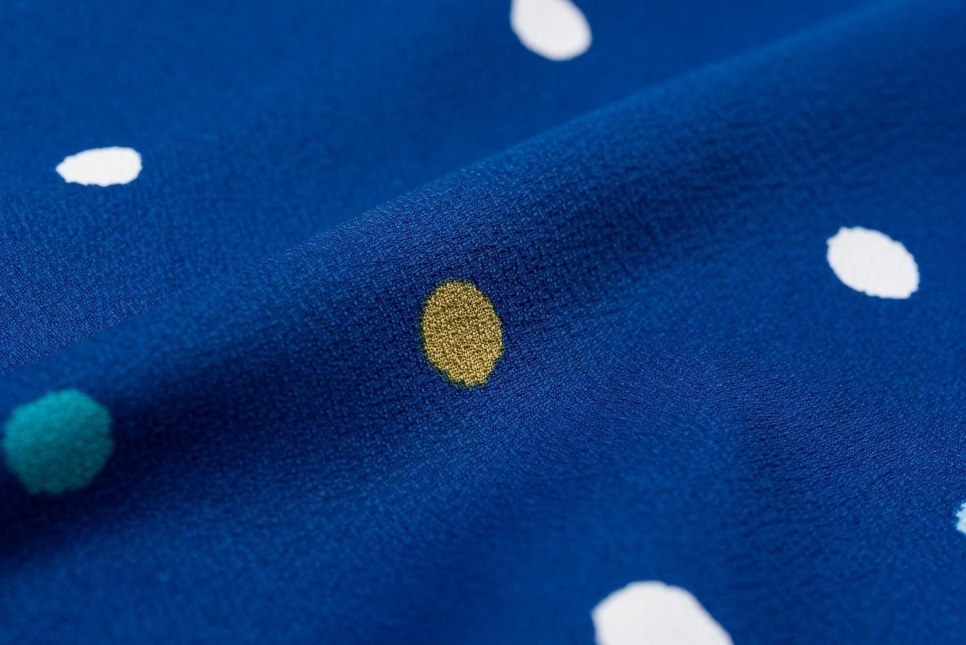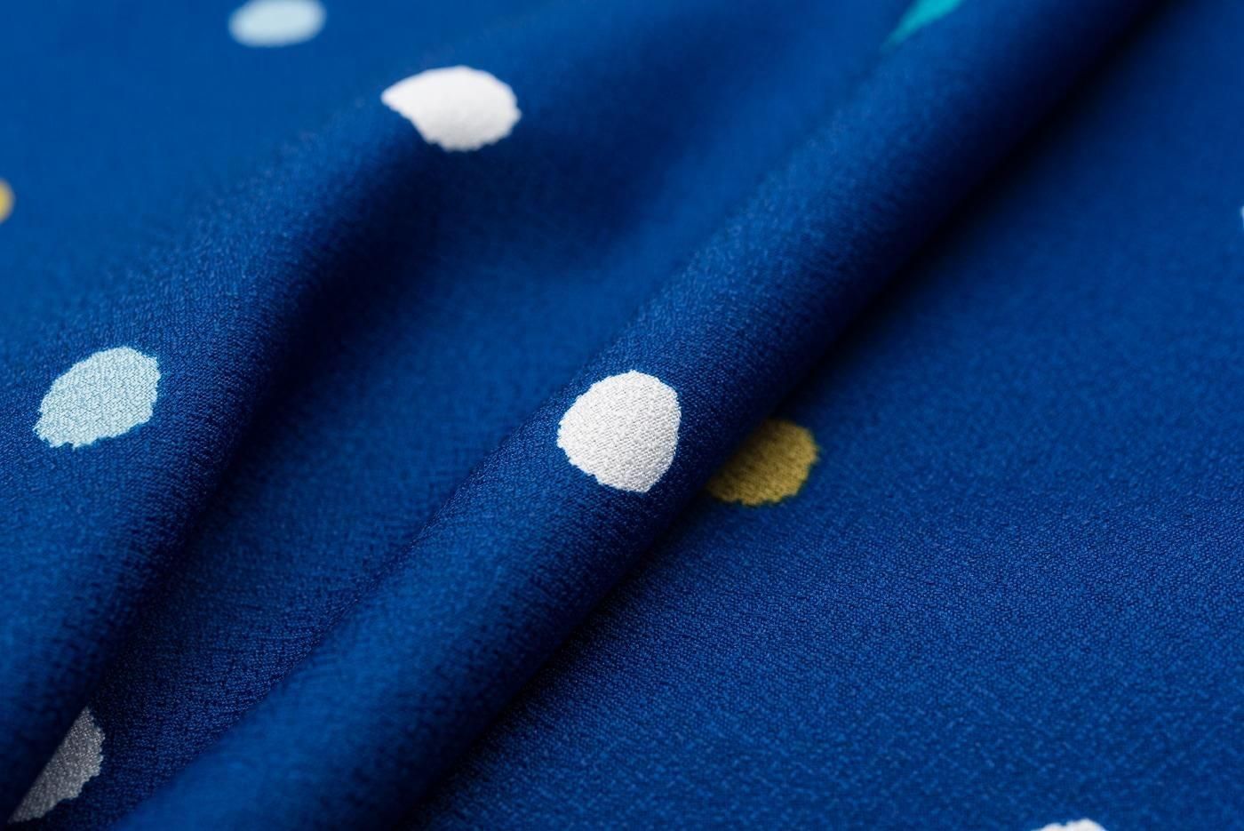 すっきりとした青色の地に三色のドット柄を染めた小紋の着物です。