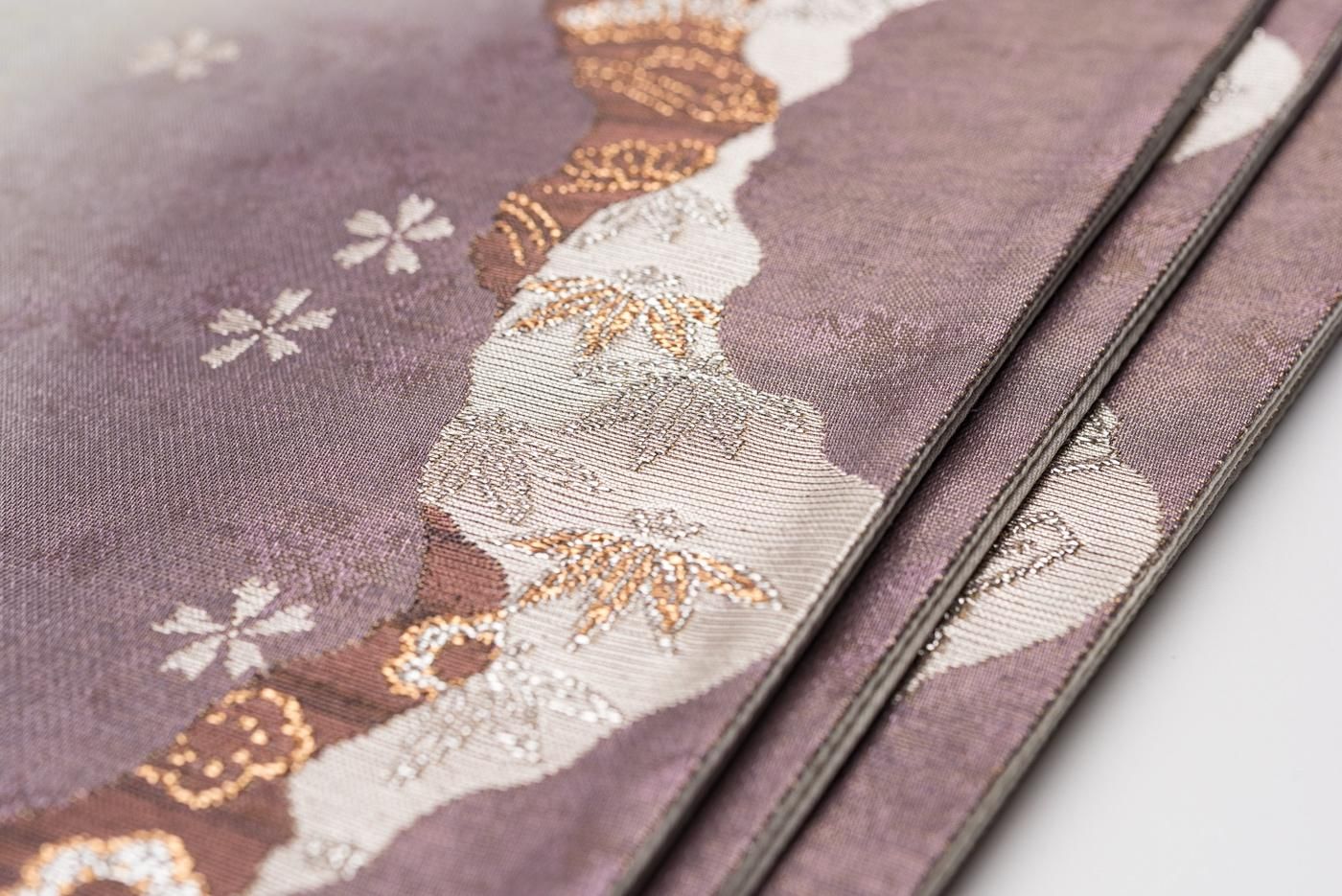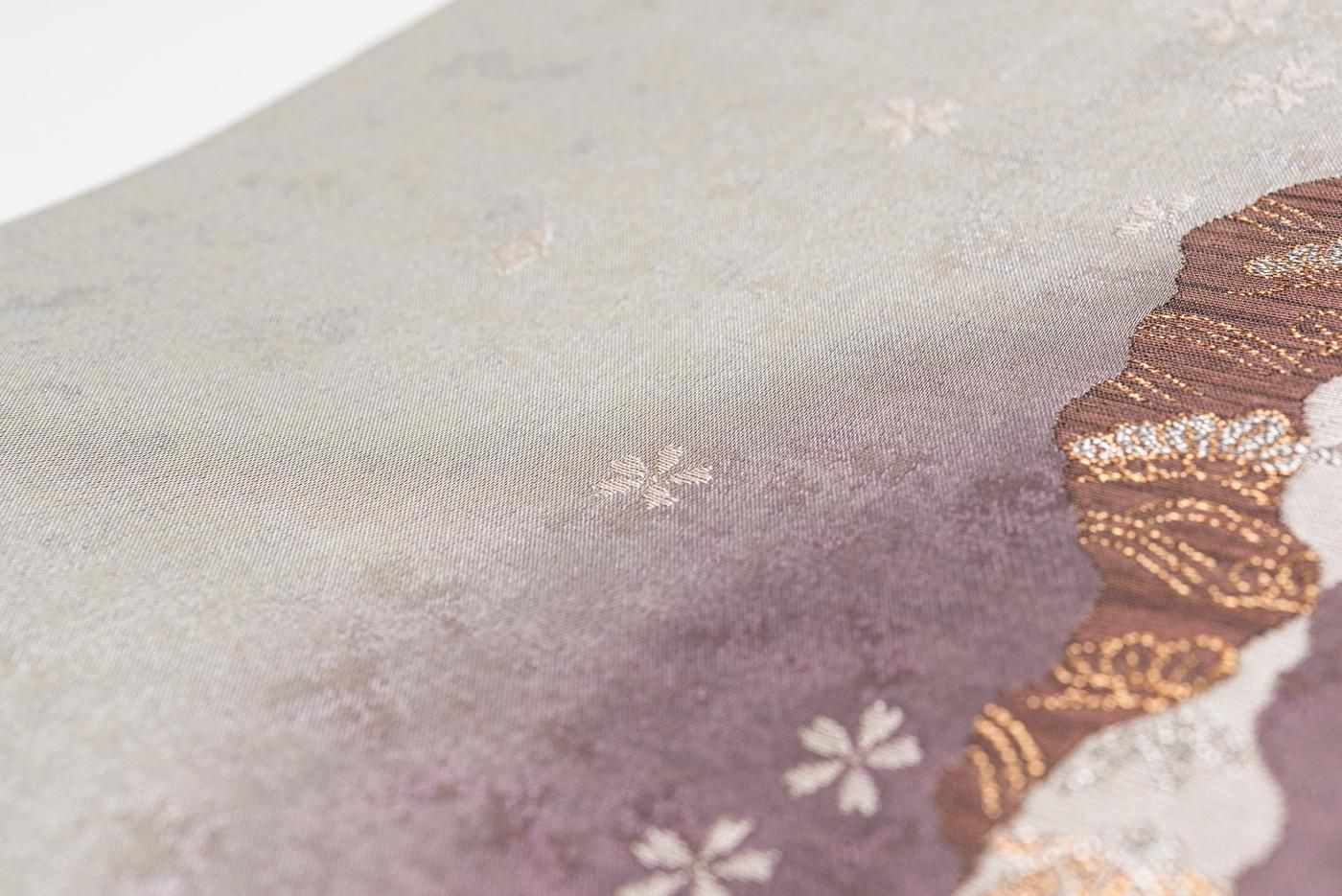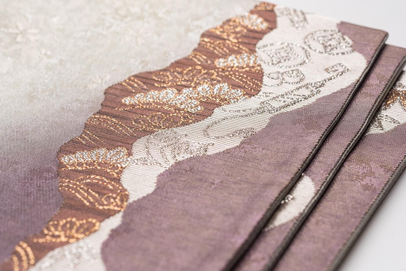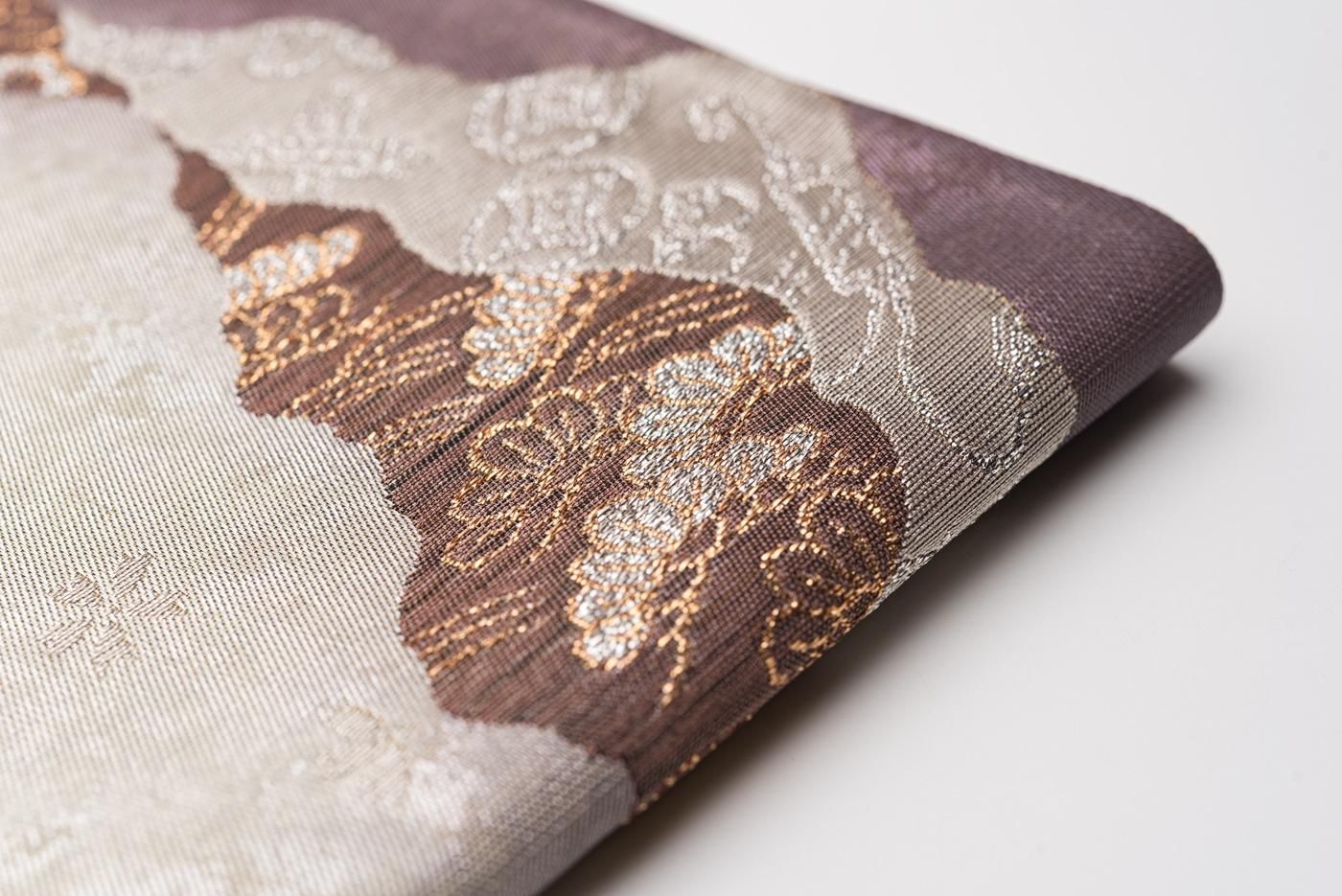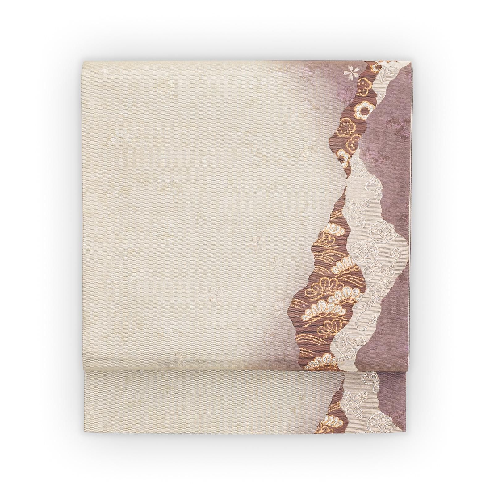 霞取りに松竹梅や宝尽くし文様を織り出した袋帯です。