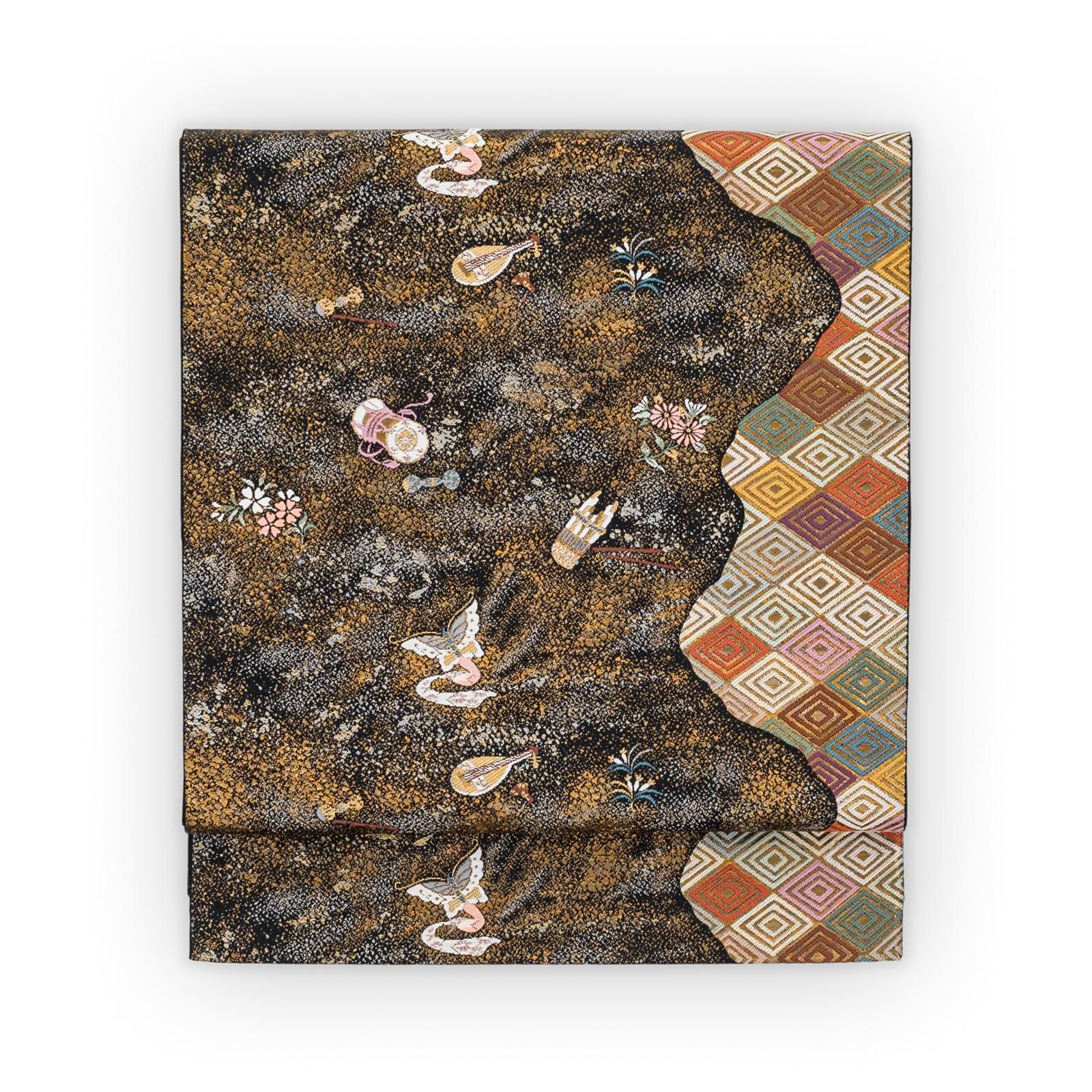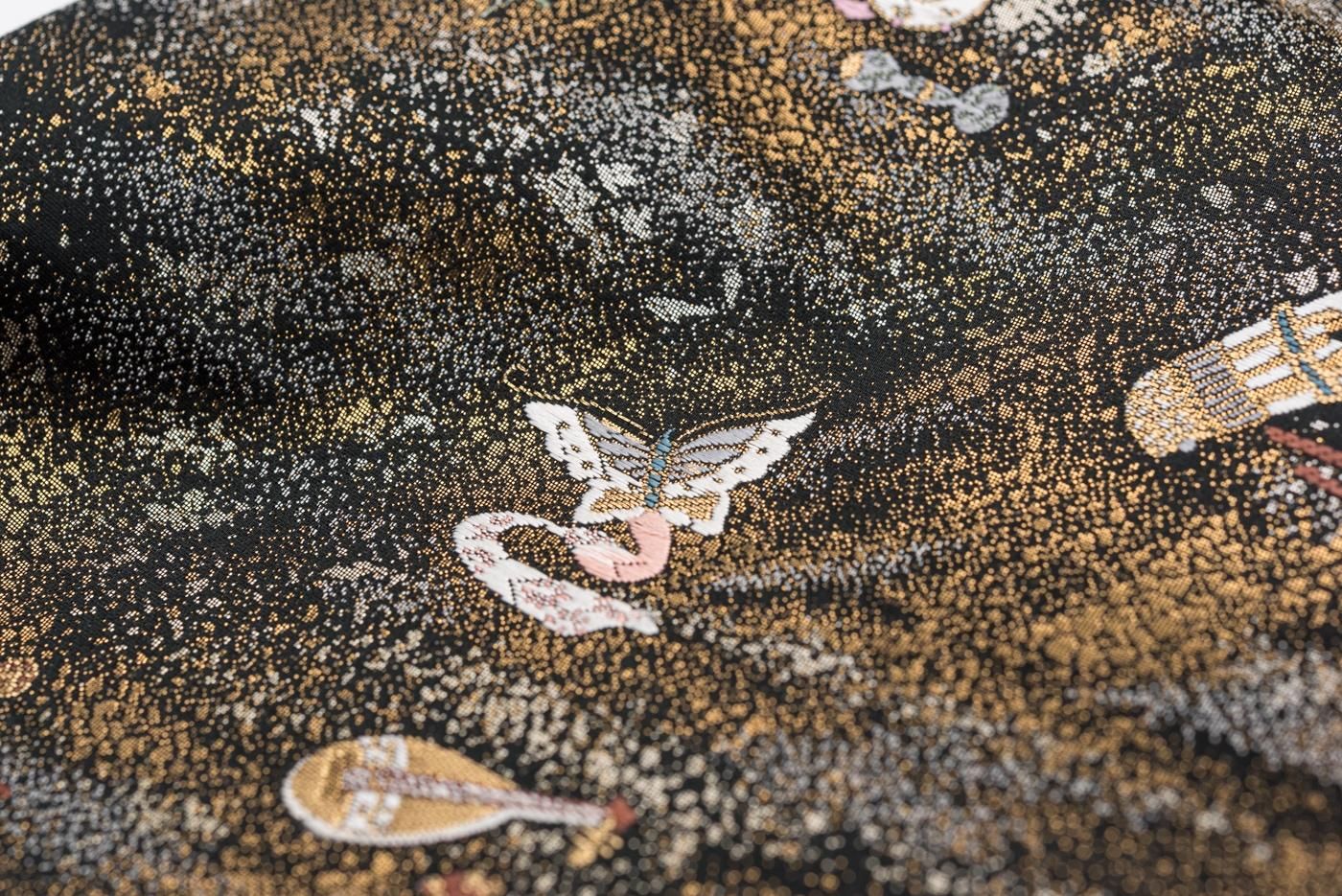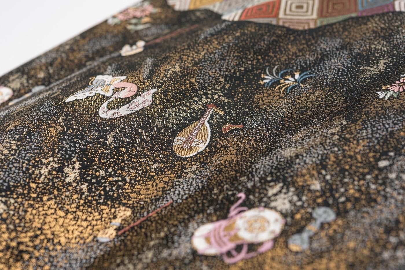 小さな和楽器や蝶々などを織り出した袋帯です。
