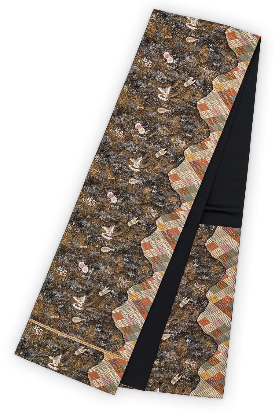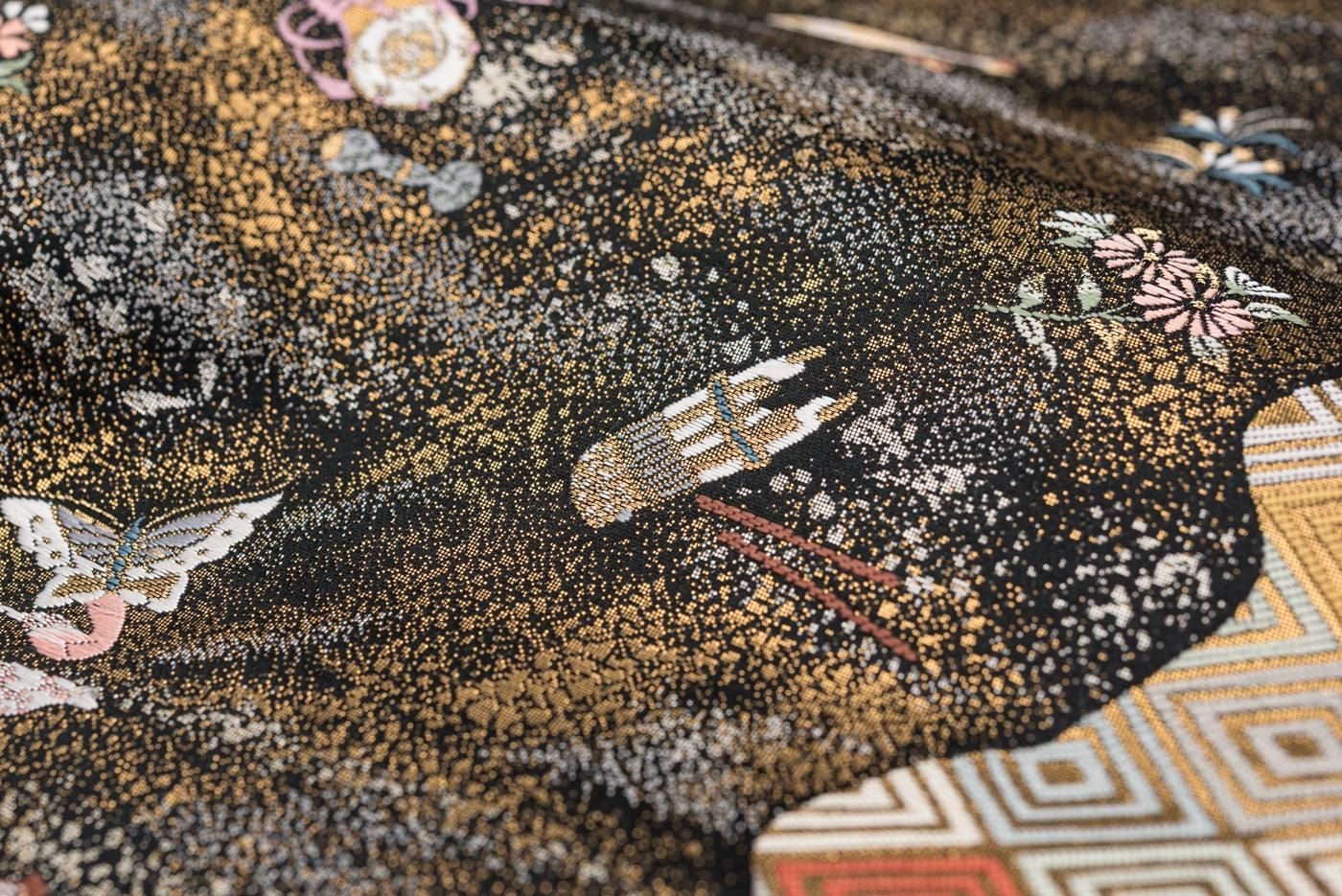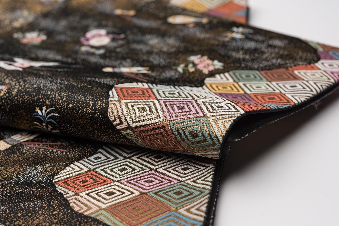 小さな和楽器や蝶々などを織り出した袋帯です。