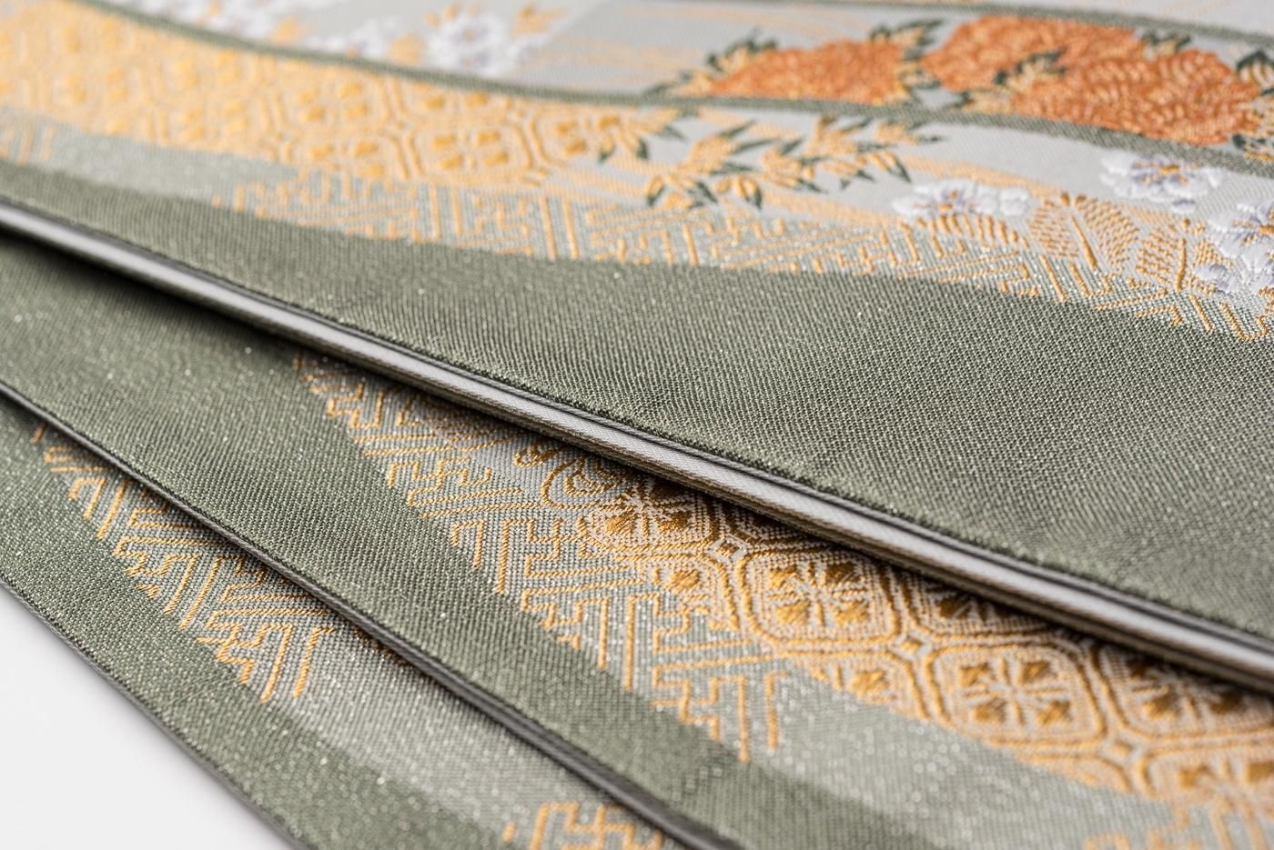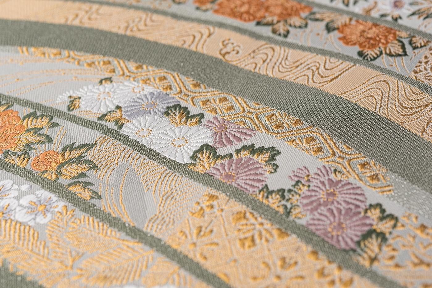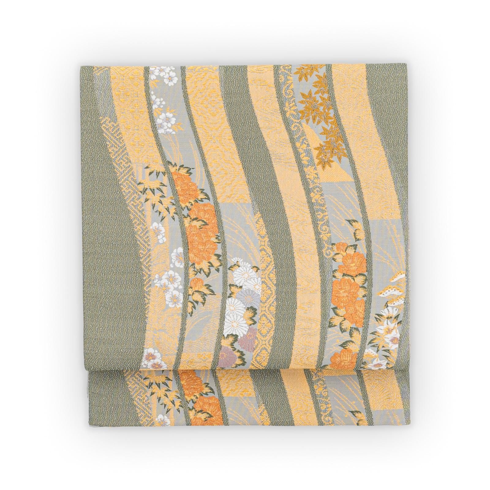 よろけ縞に牡丹、菊、女郎花、桜など四季の花を織り出した袋帯です。