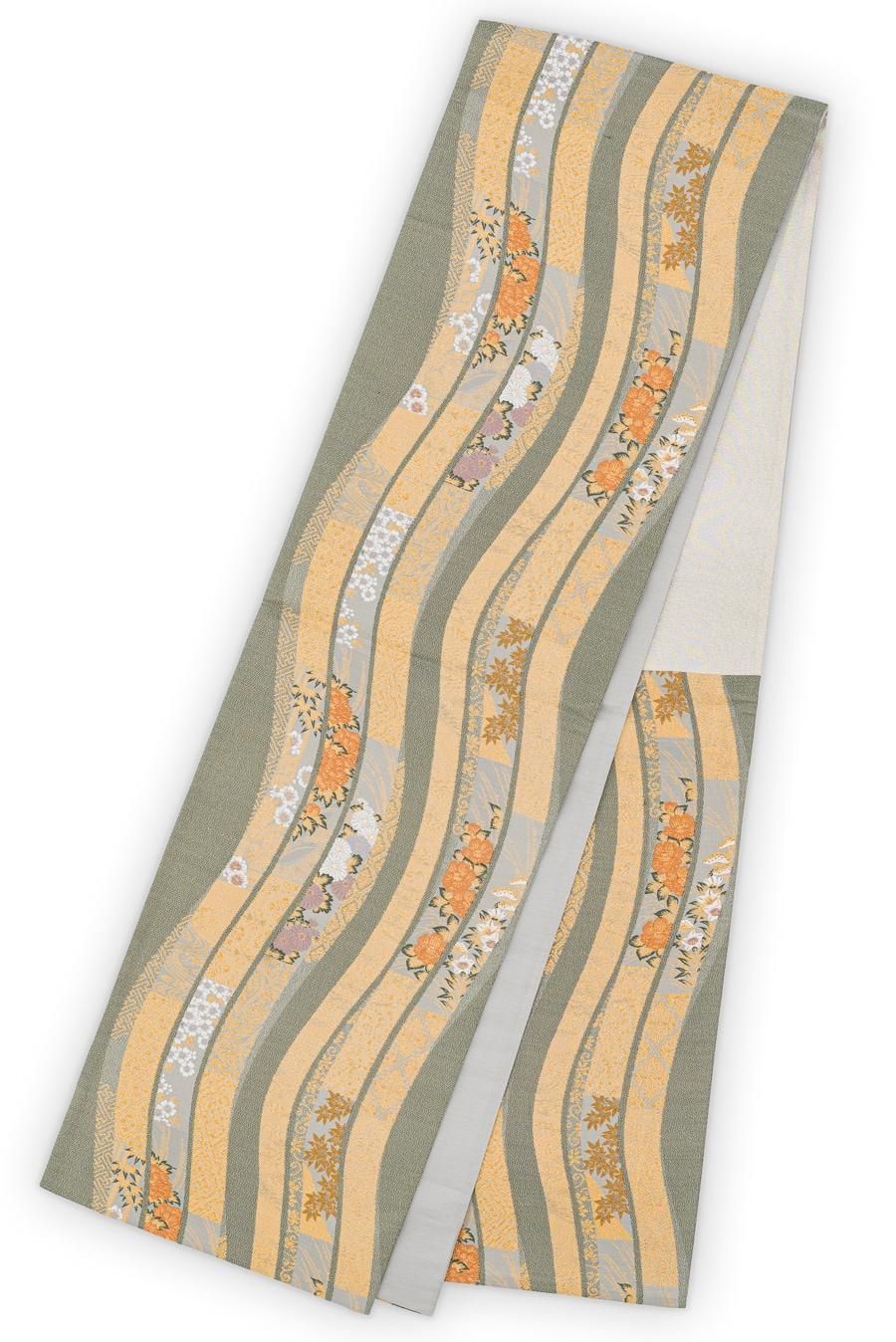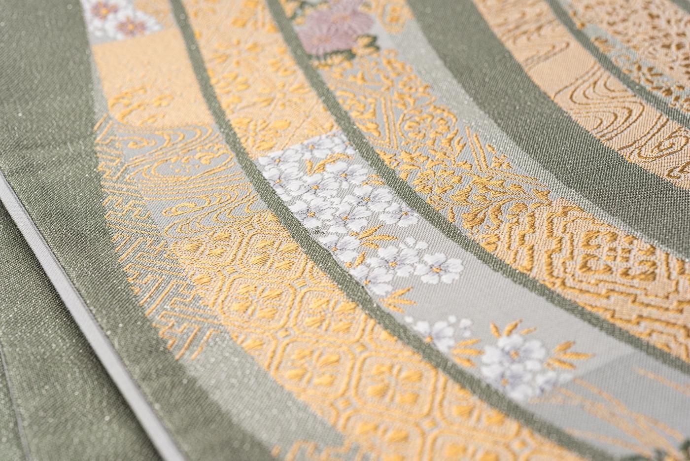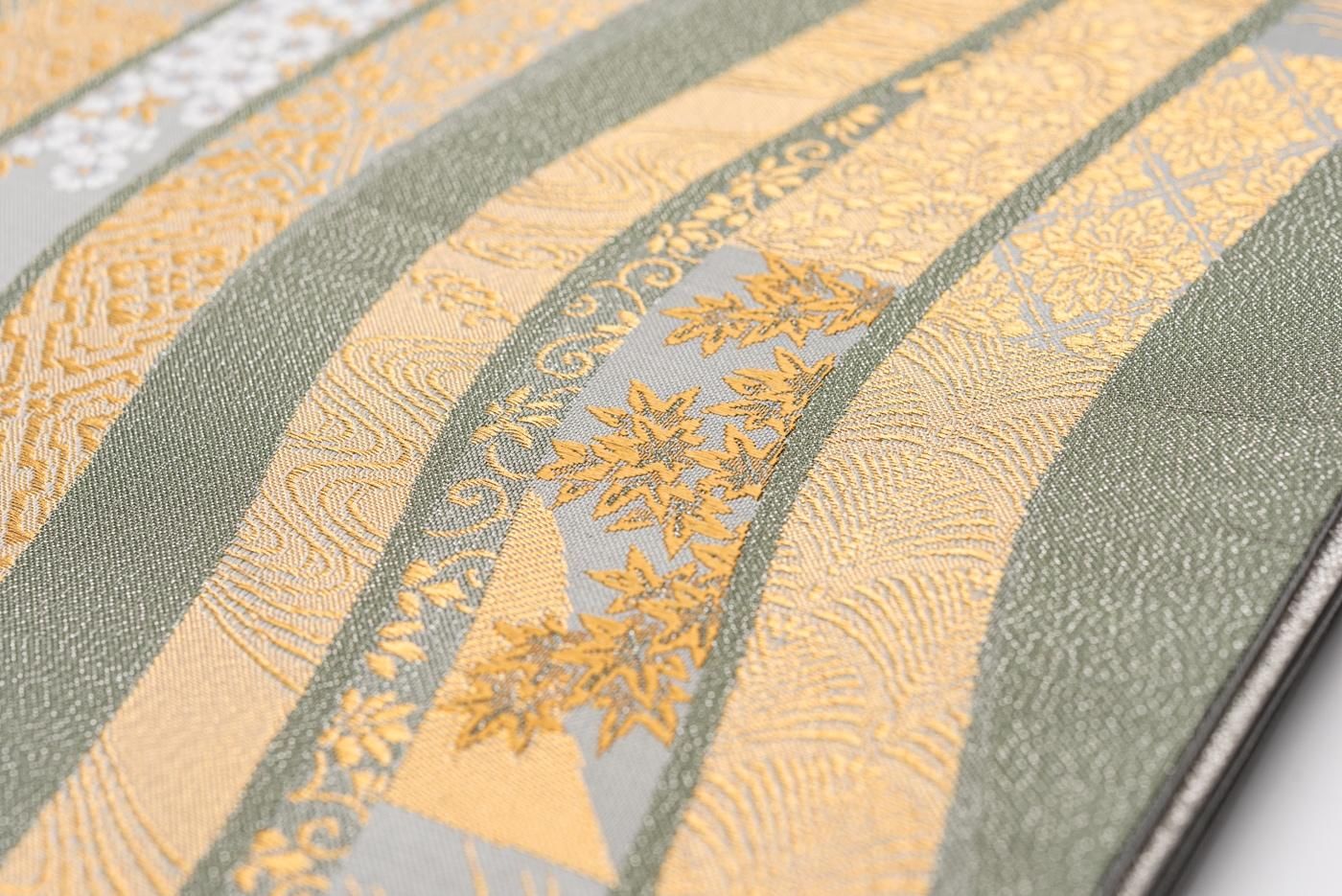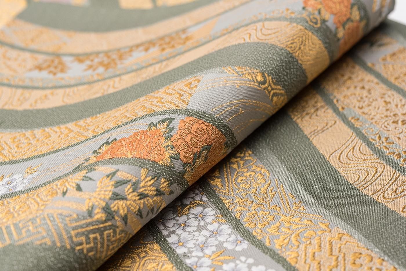 よろけ縞に牡丹、菊、女郎花、桜など四季の花を織り出した袋帯です。