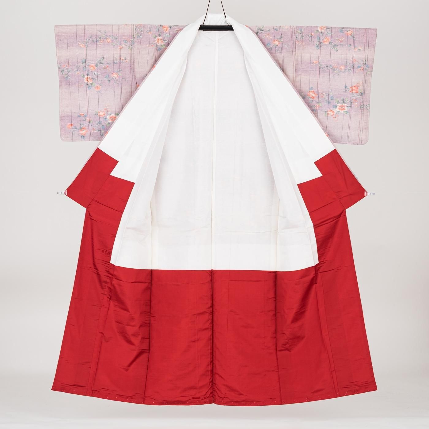 赤紫の横段暈しに花模様を織り出した紬の着物です。