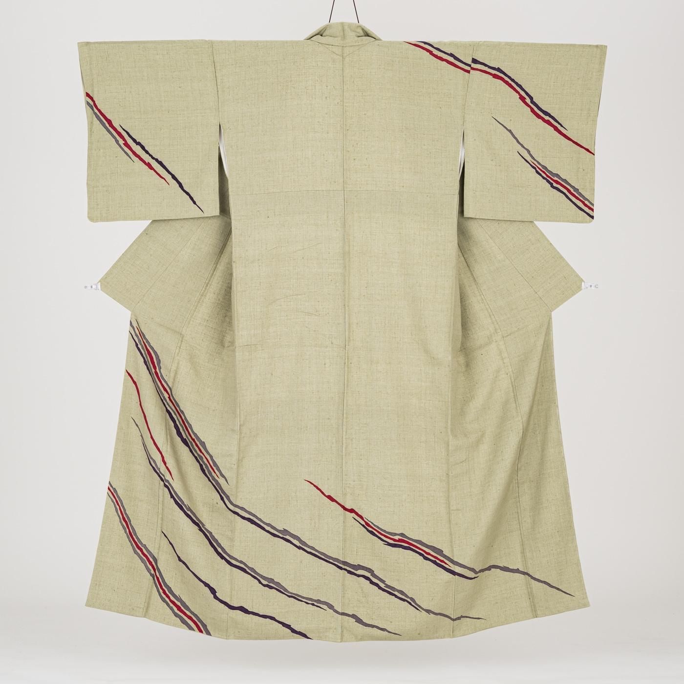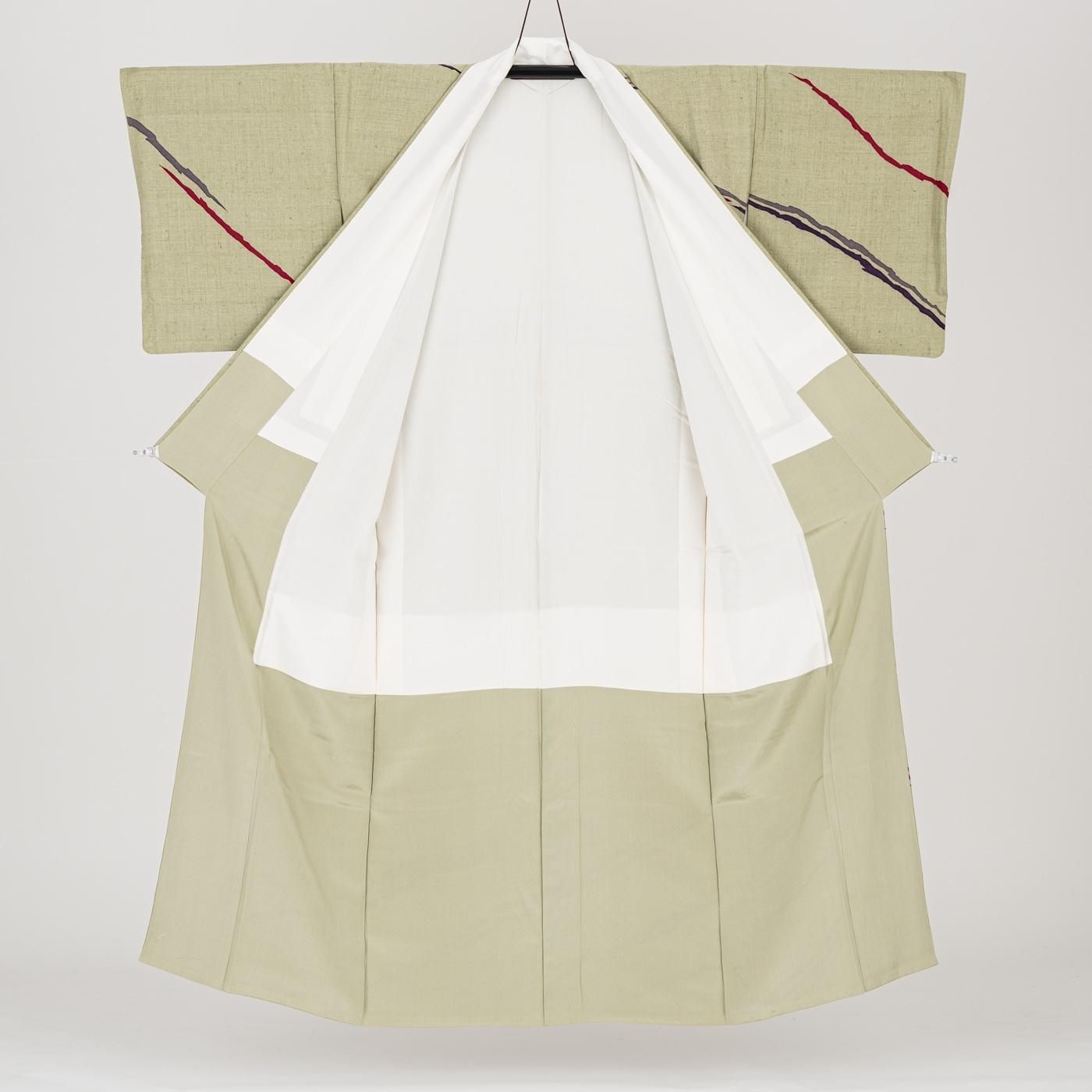 柳茶色の紬地に斜めの縞模様を染めた訪問着です。