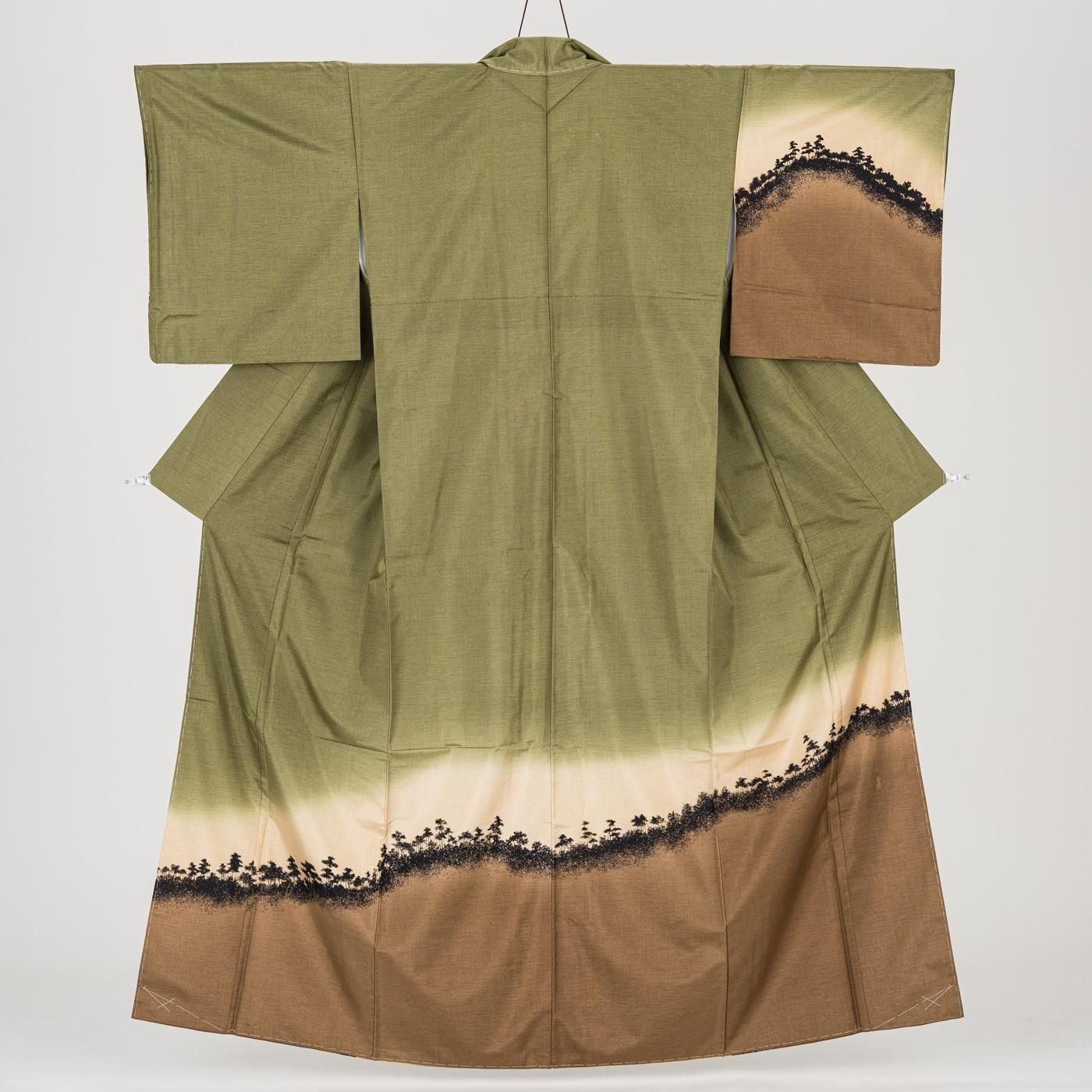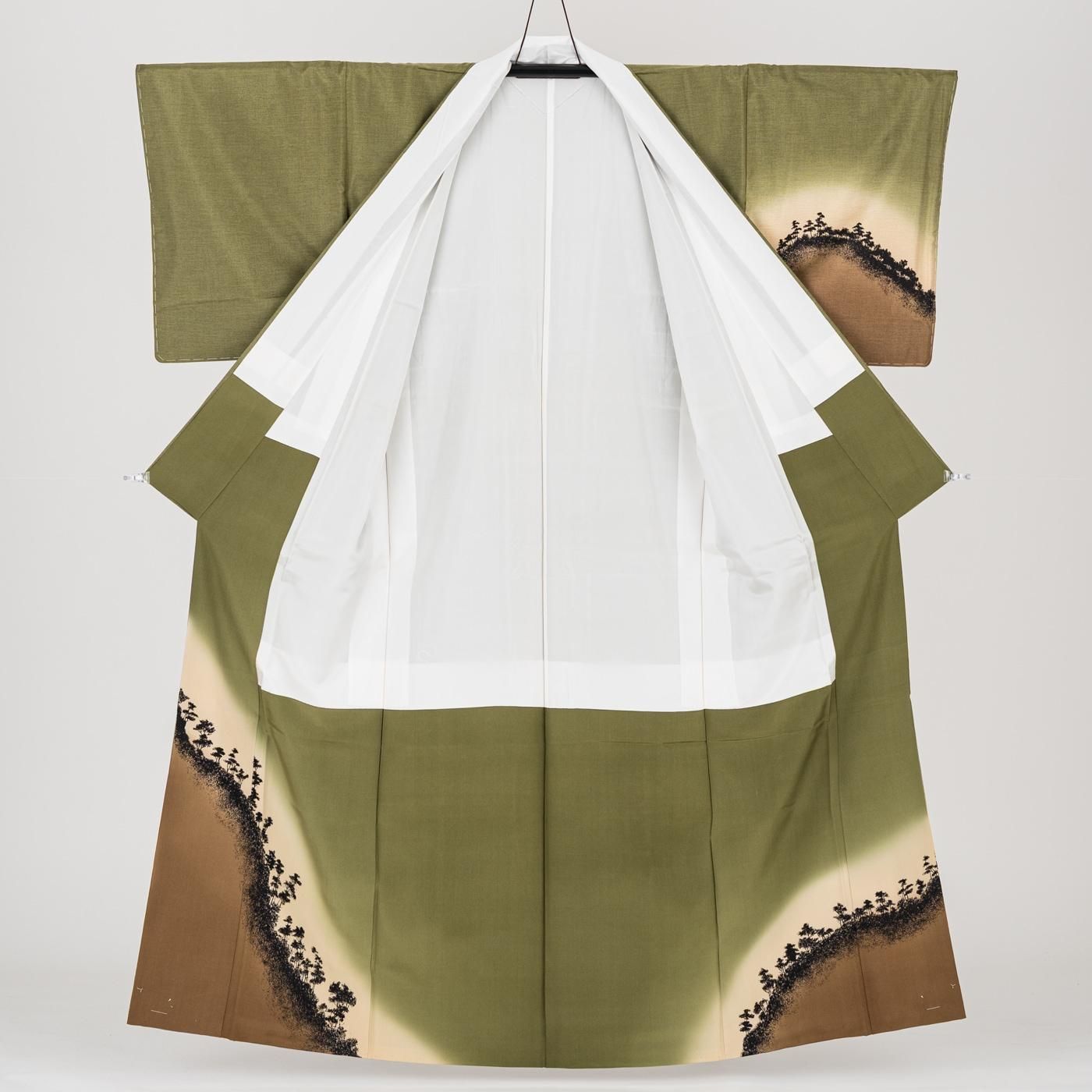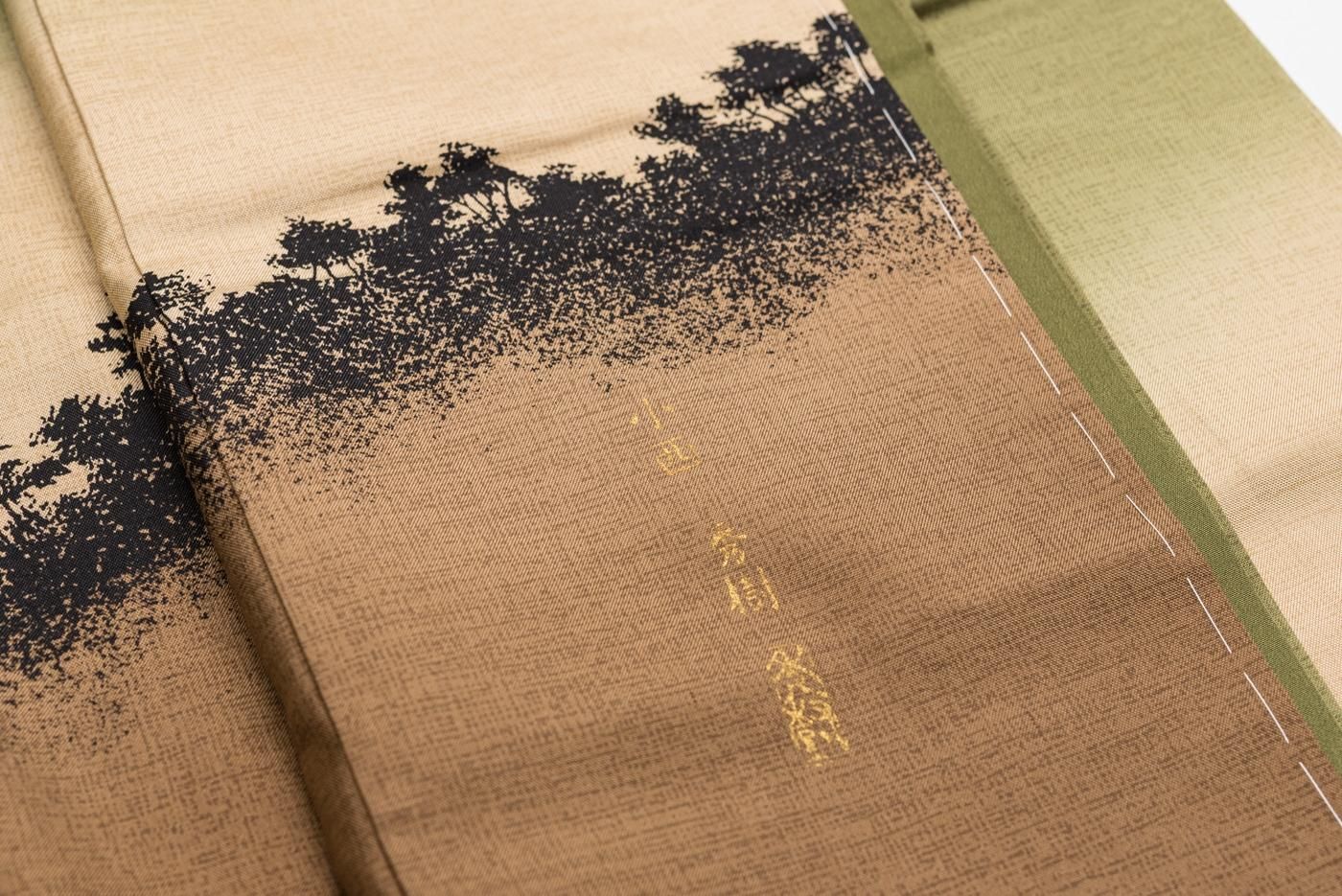 落ち着いた抹茶色と裾の茶色を分断するように道を通したデザインは大胆でいて主張しすぎず、どこか奥ゆかしささえ感じさせます。
