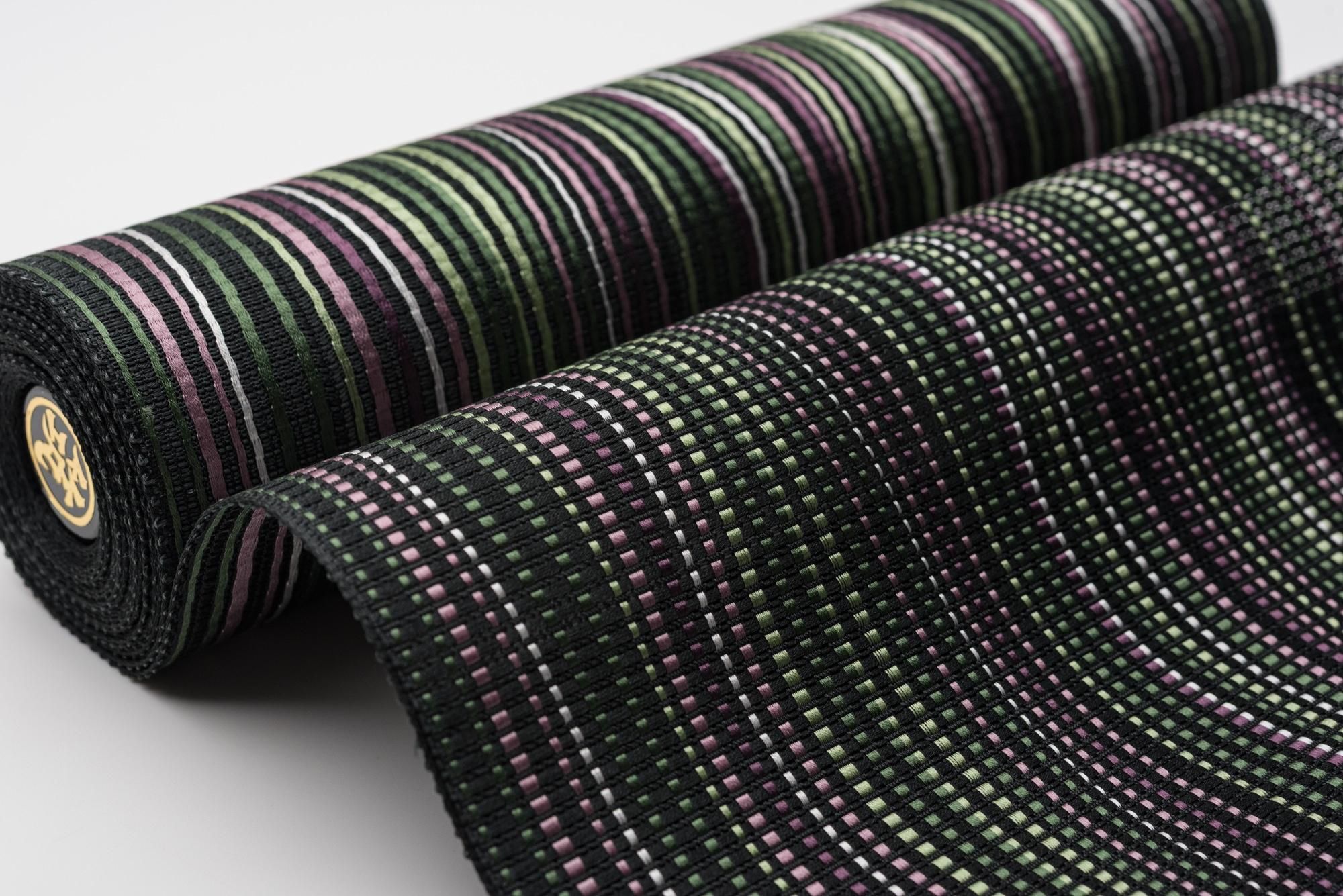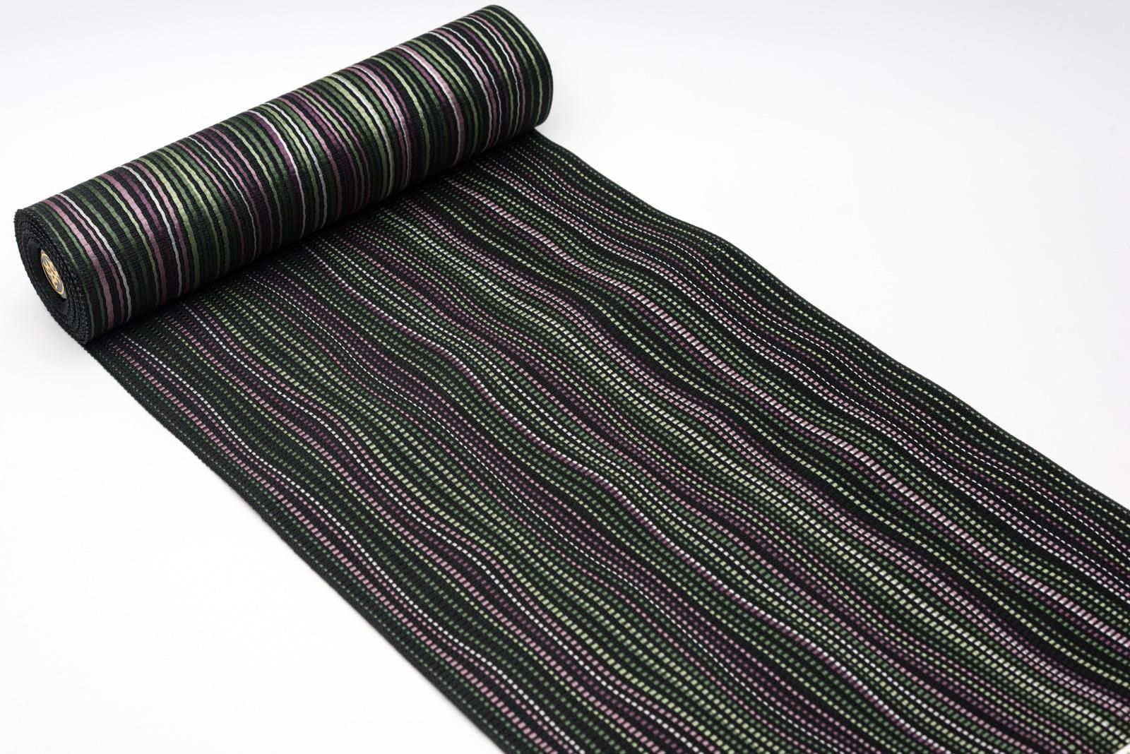 黒地に細いよろけ縞模様が浮かぶ博多紋八寸名古屋帯です。