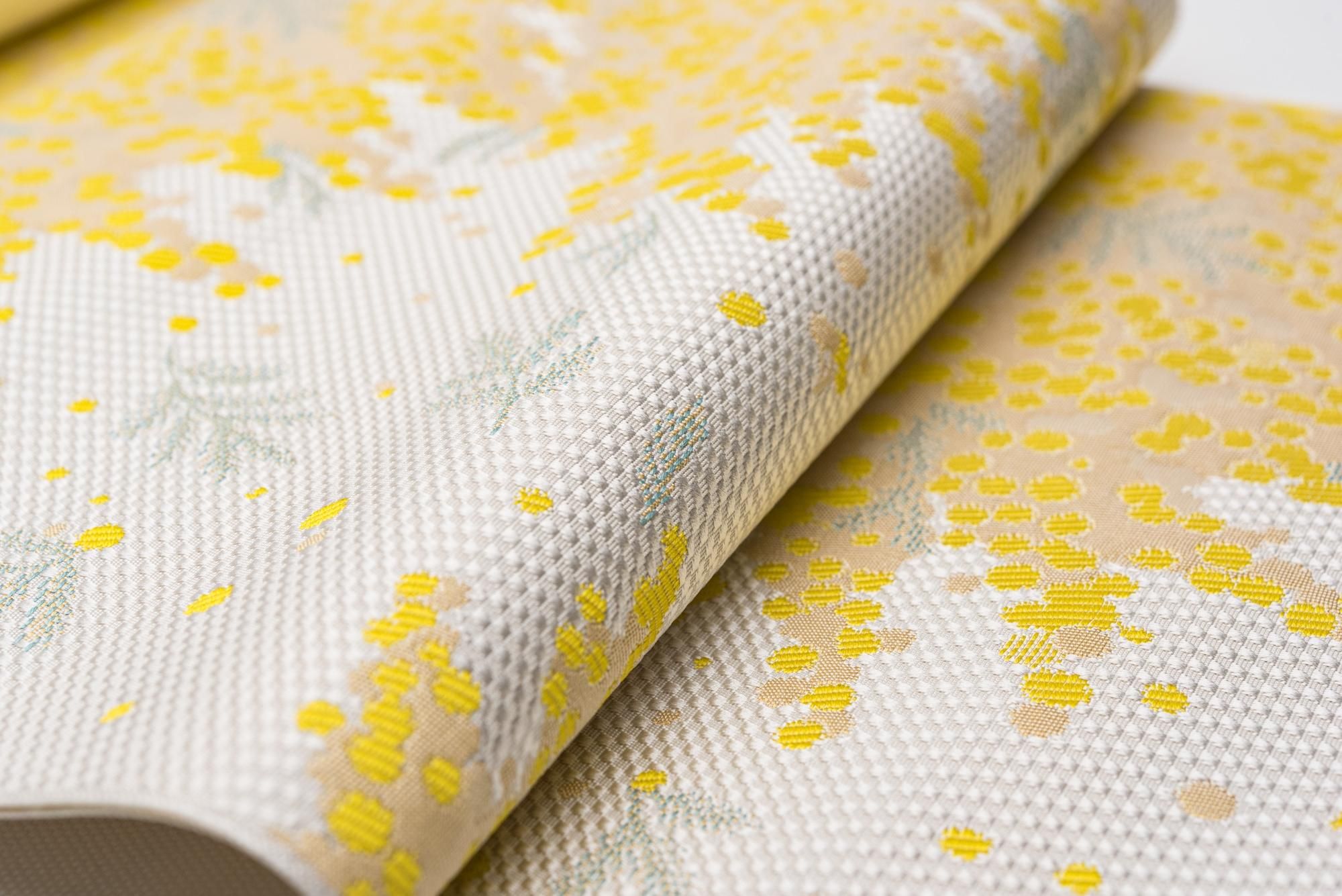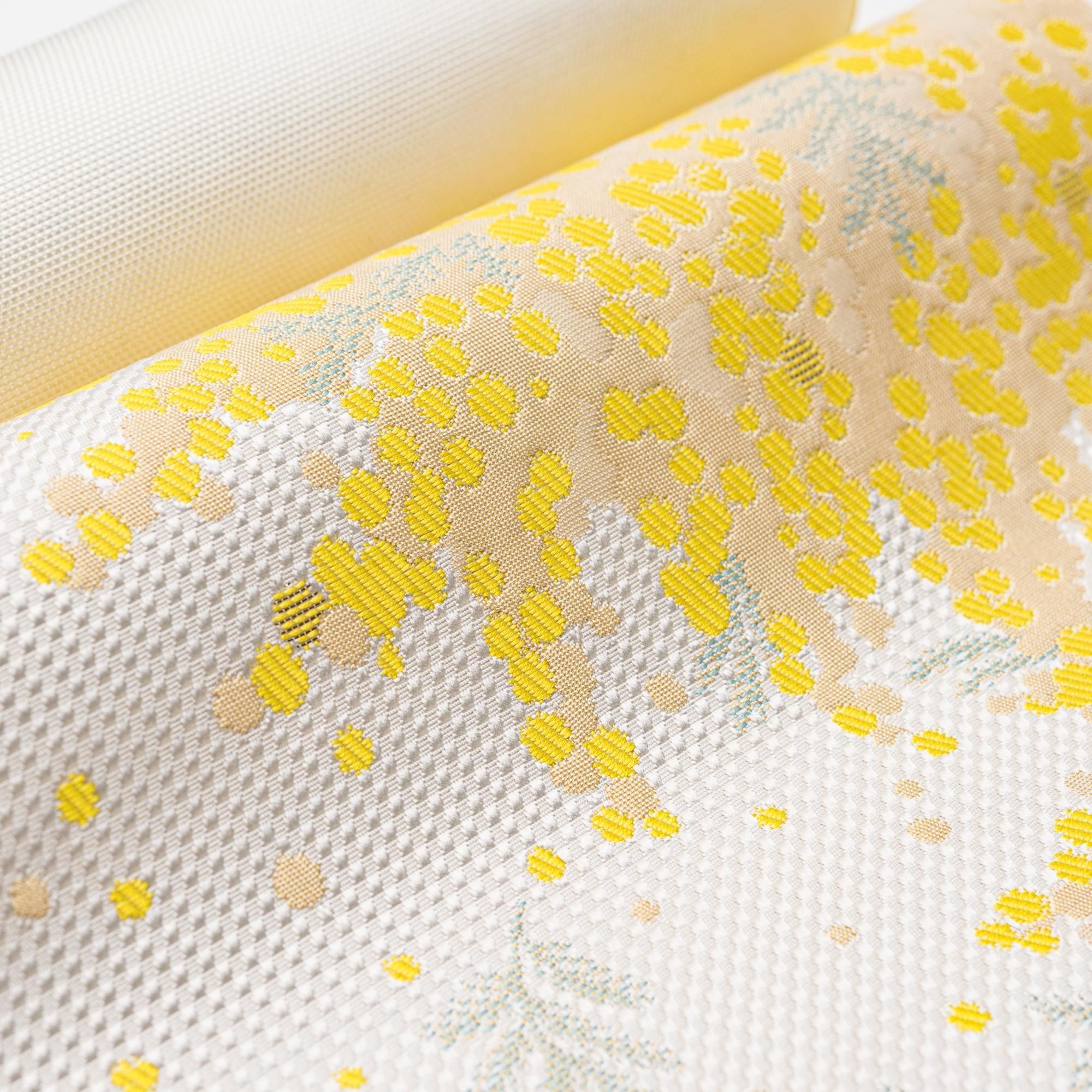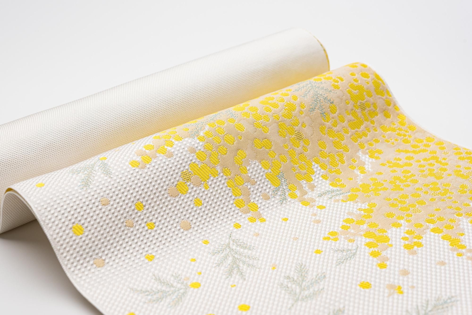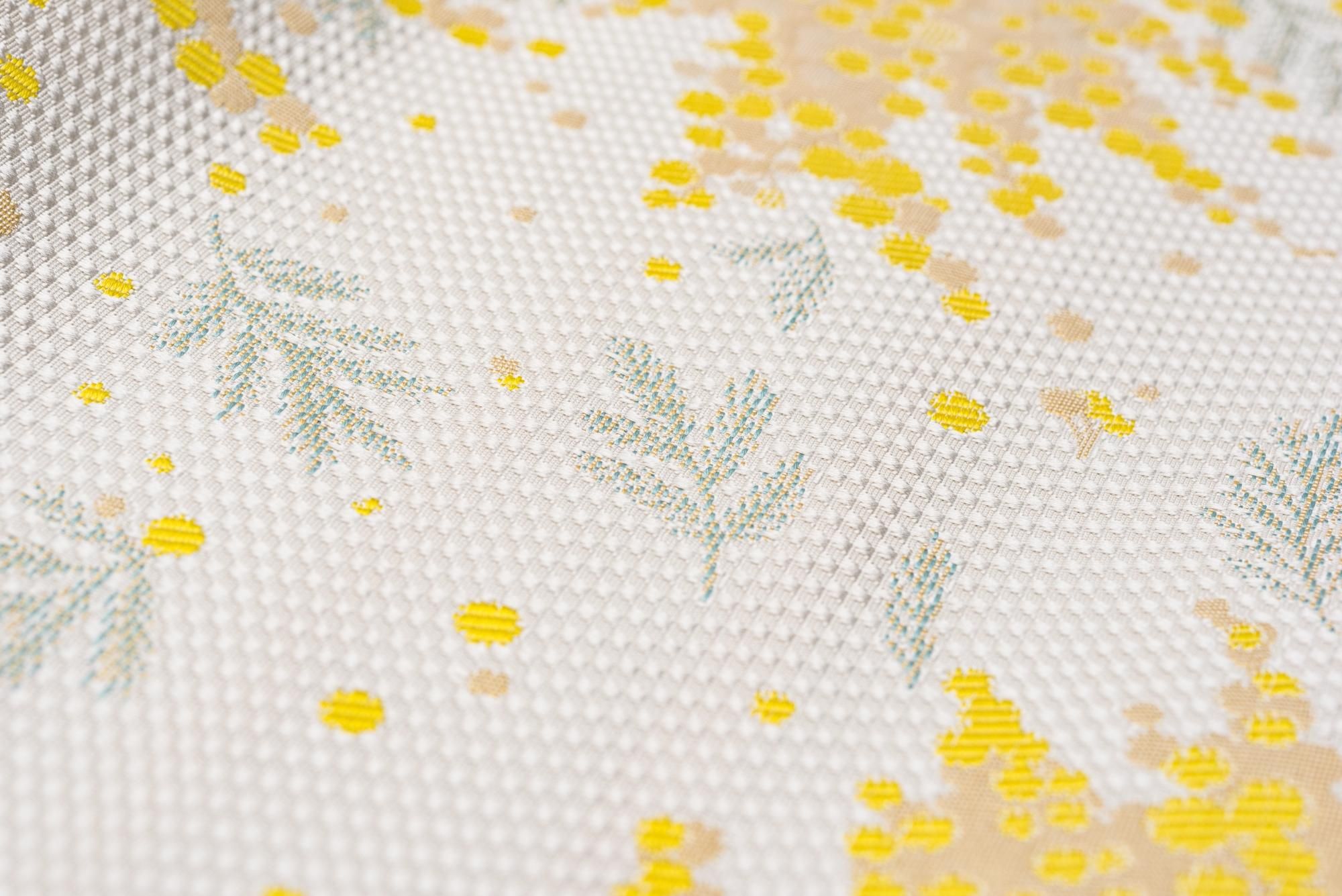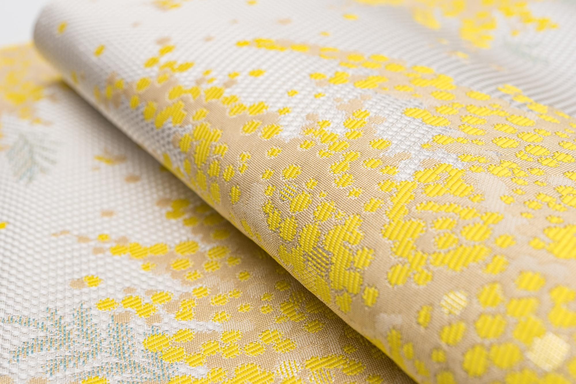 ミモザの鮮やかな黄色い花が美しく表現された博多織の八寸名古屋帯です。