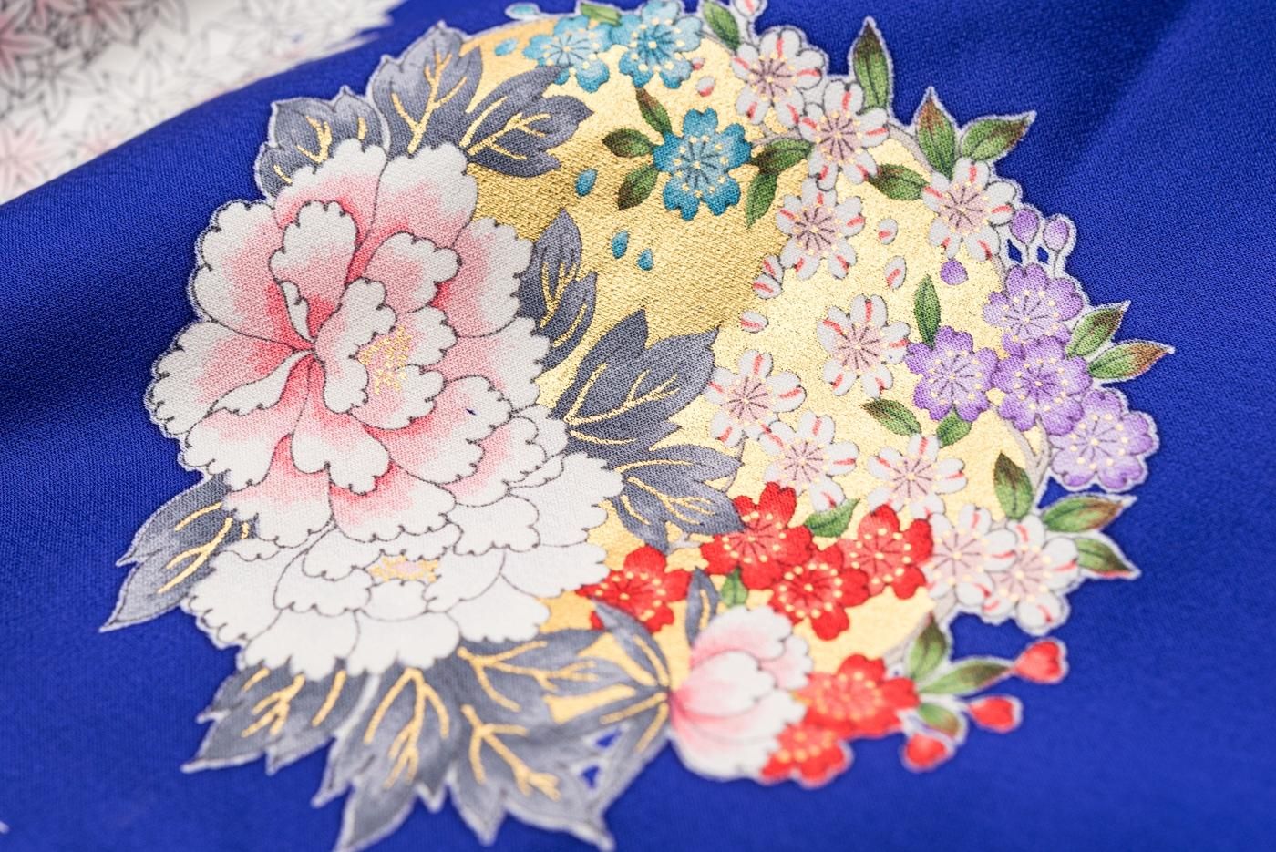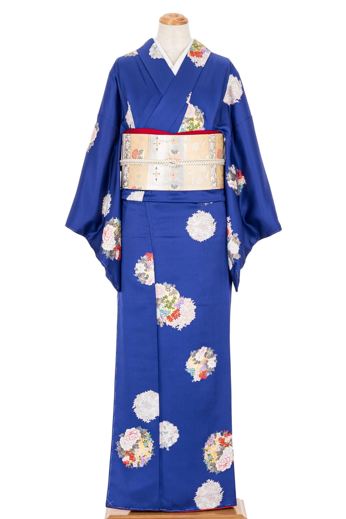 鮮やかな青の地に四季の花を写した小紋の着物です。