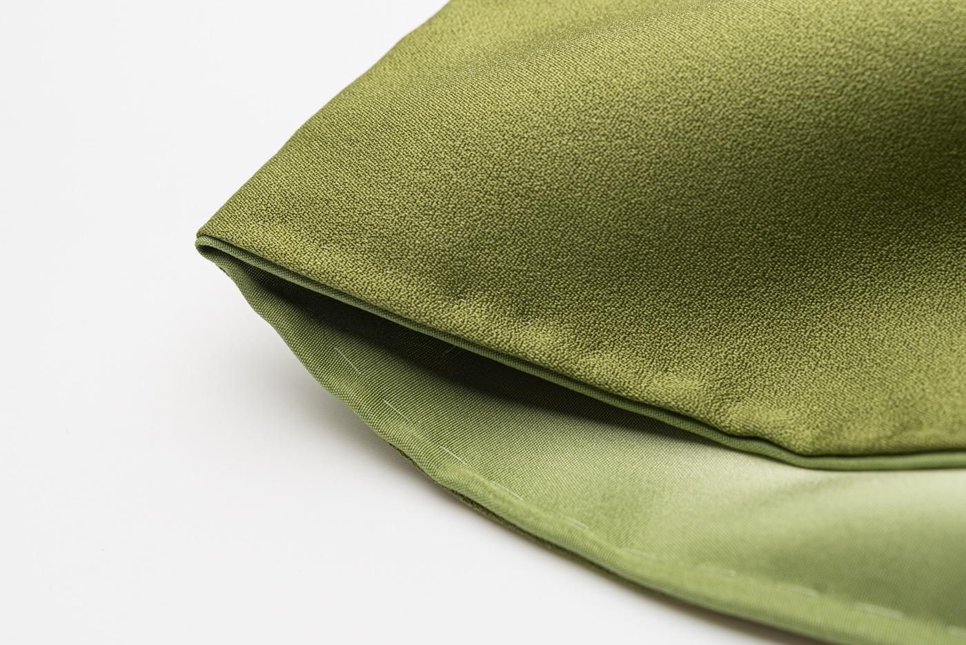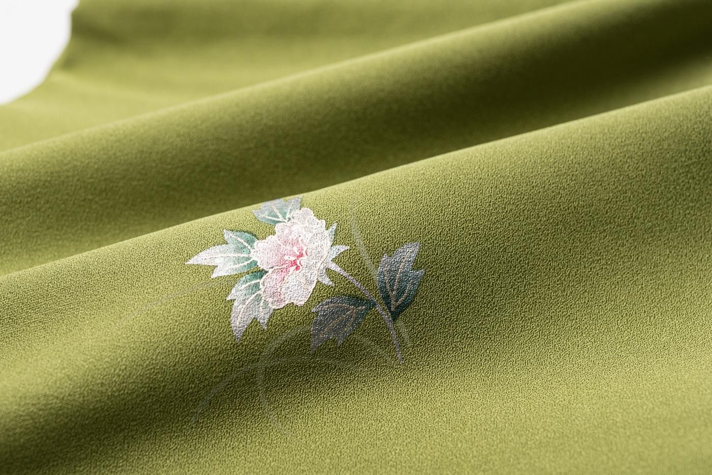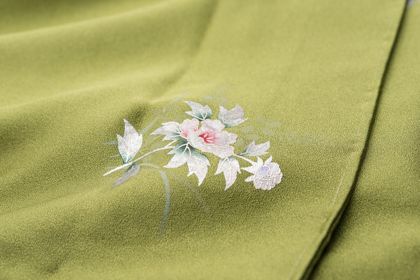 こっくりとした黄緑色の地に箔置きの柄がほのかに輝く控えめで愛らしいデザインです。