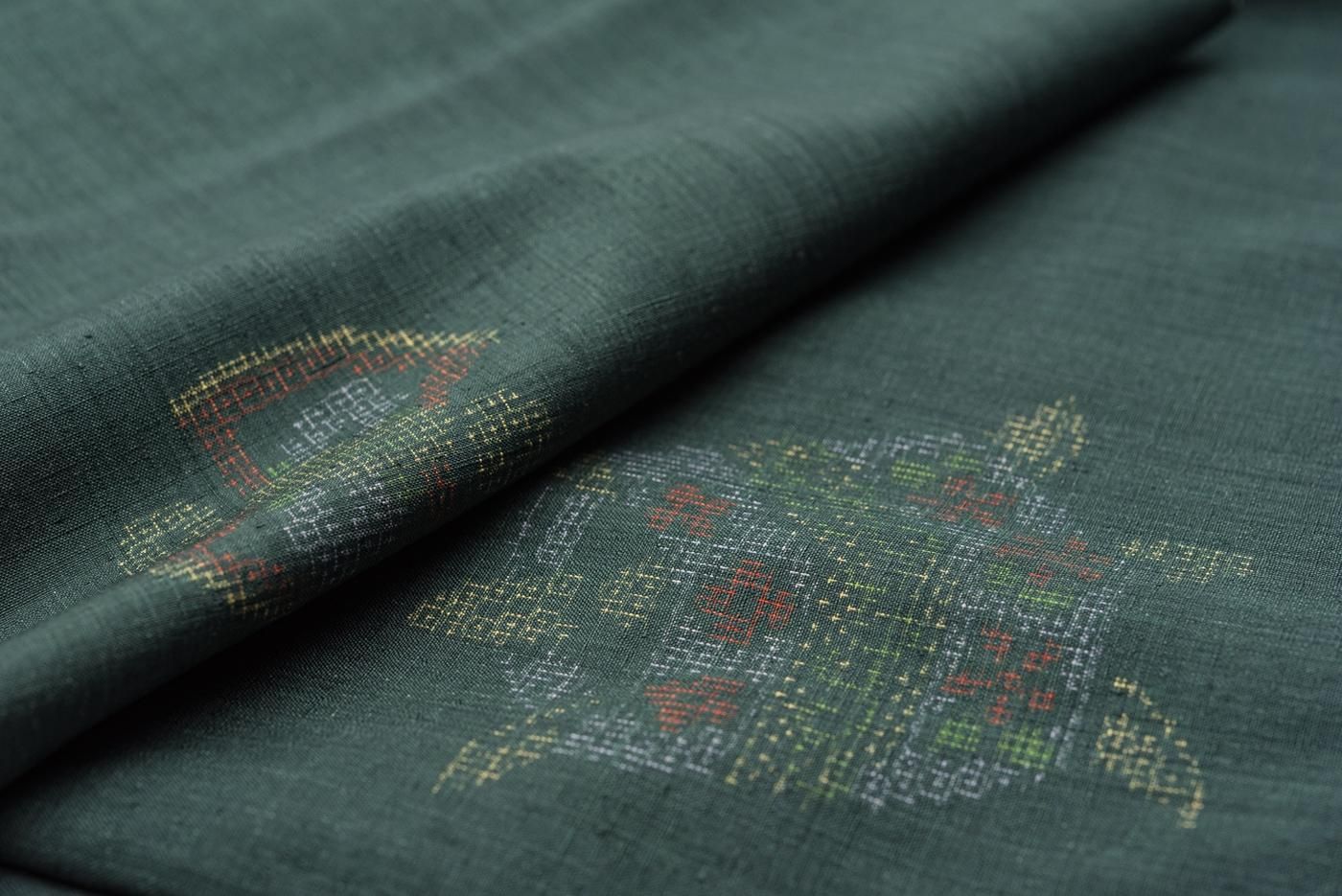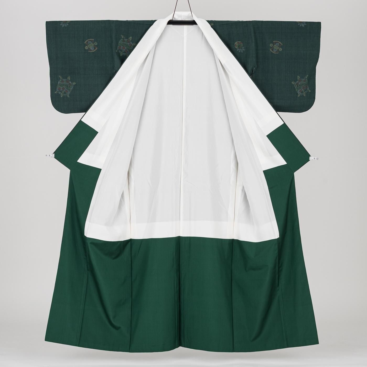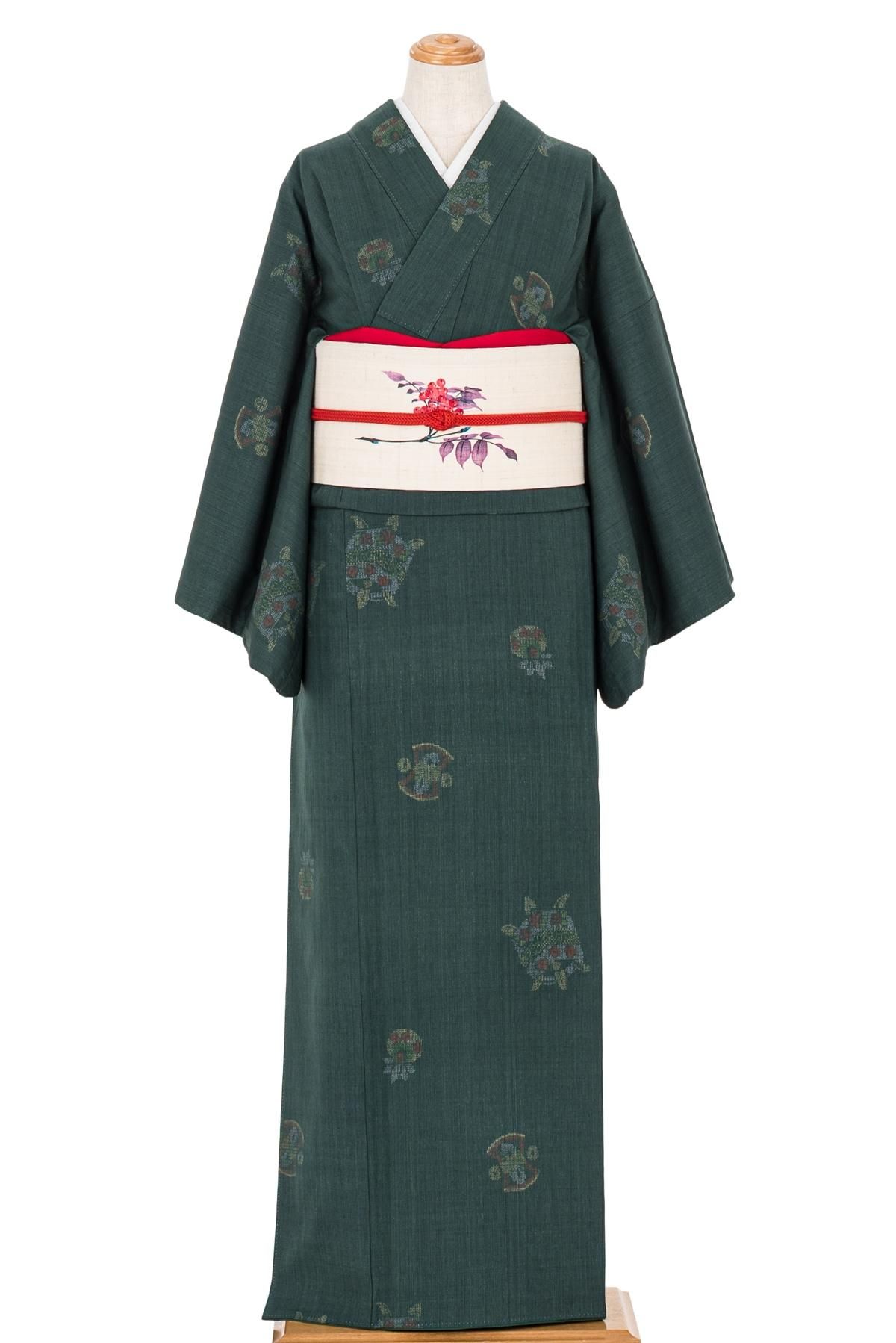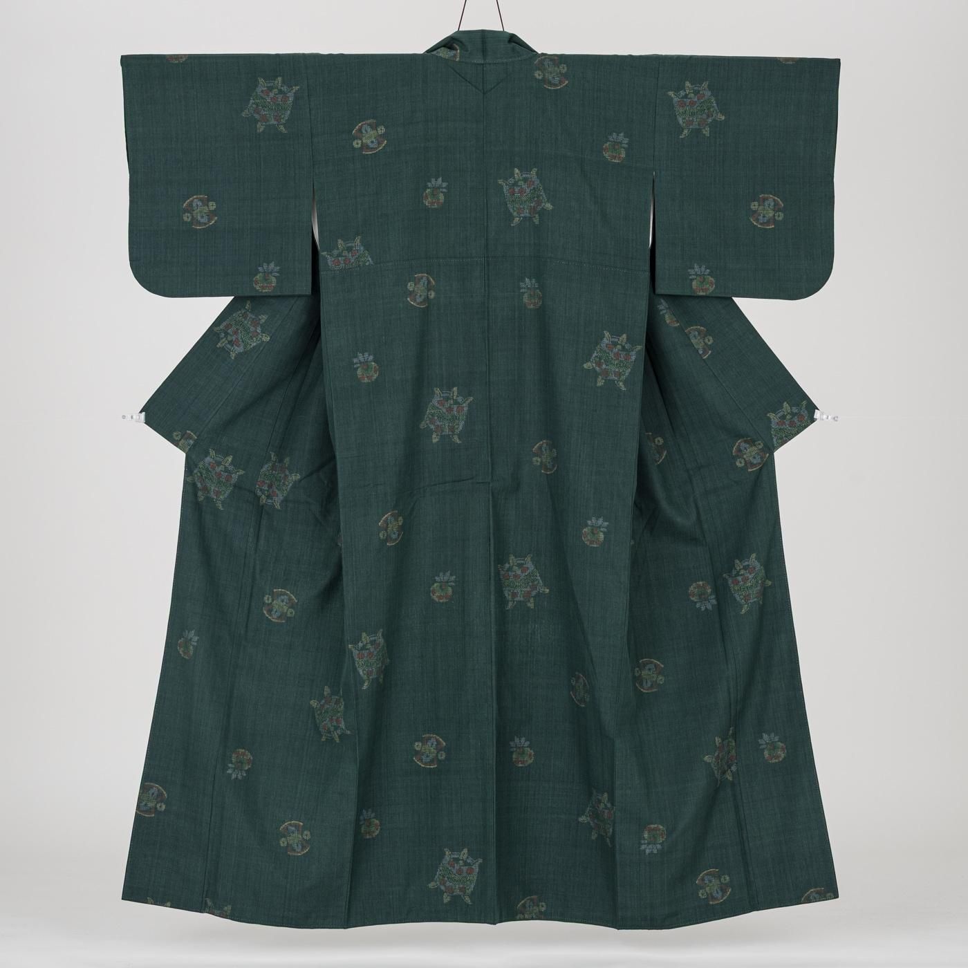 落ち着いた緑色の地に糸巻きと分銅を織り出した紬の着物です。