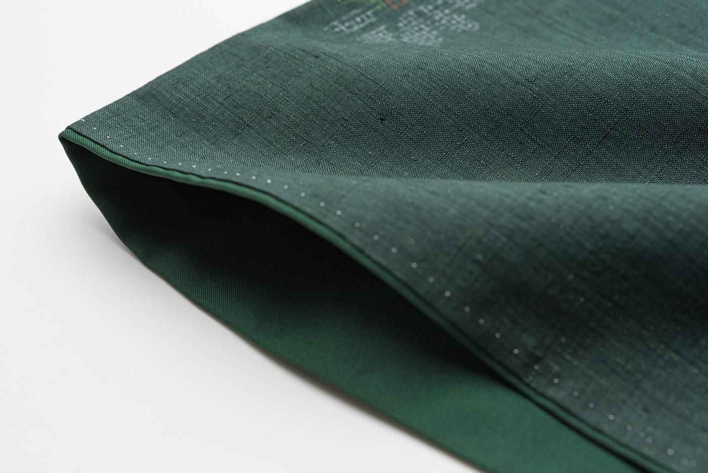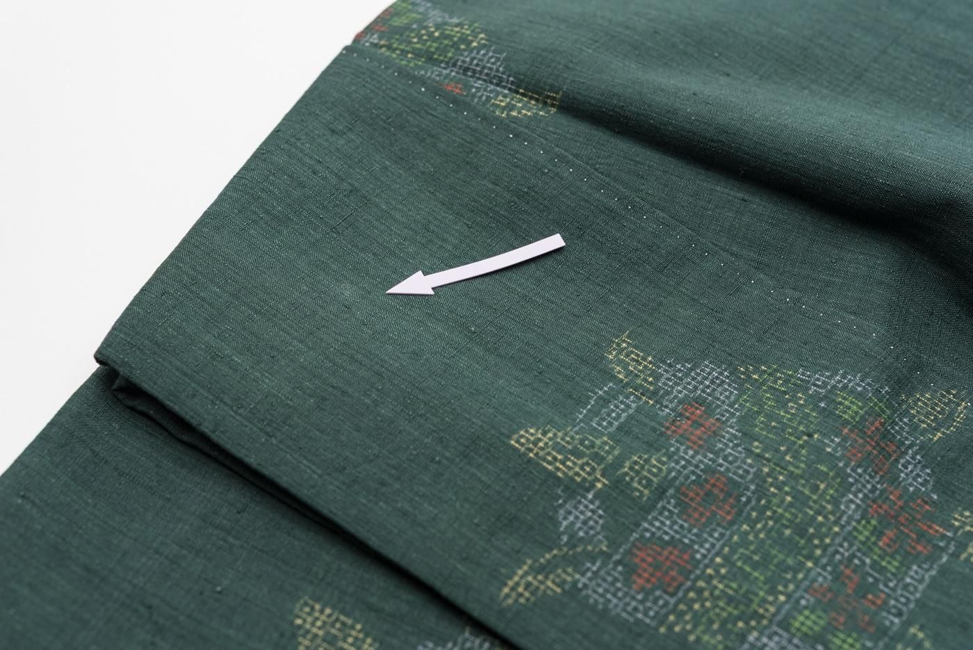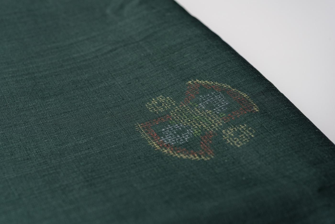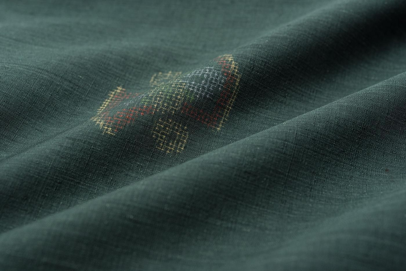 落ち着いた緑色の地に糸巻きと分銅を織り出した紬の着物です。