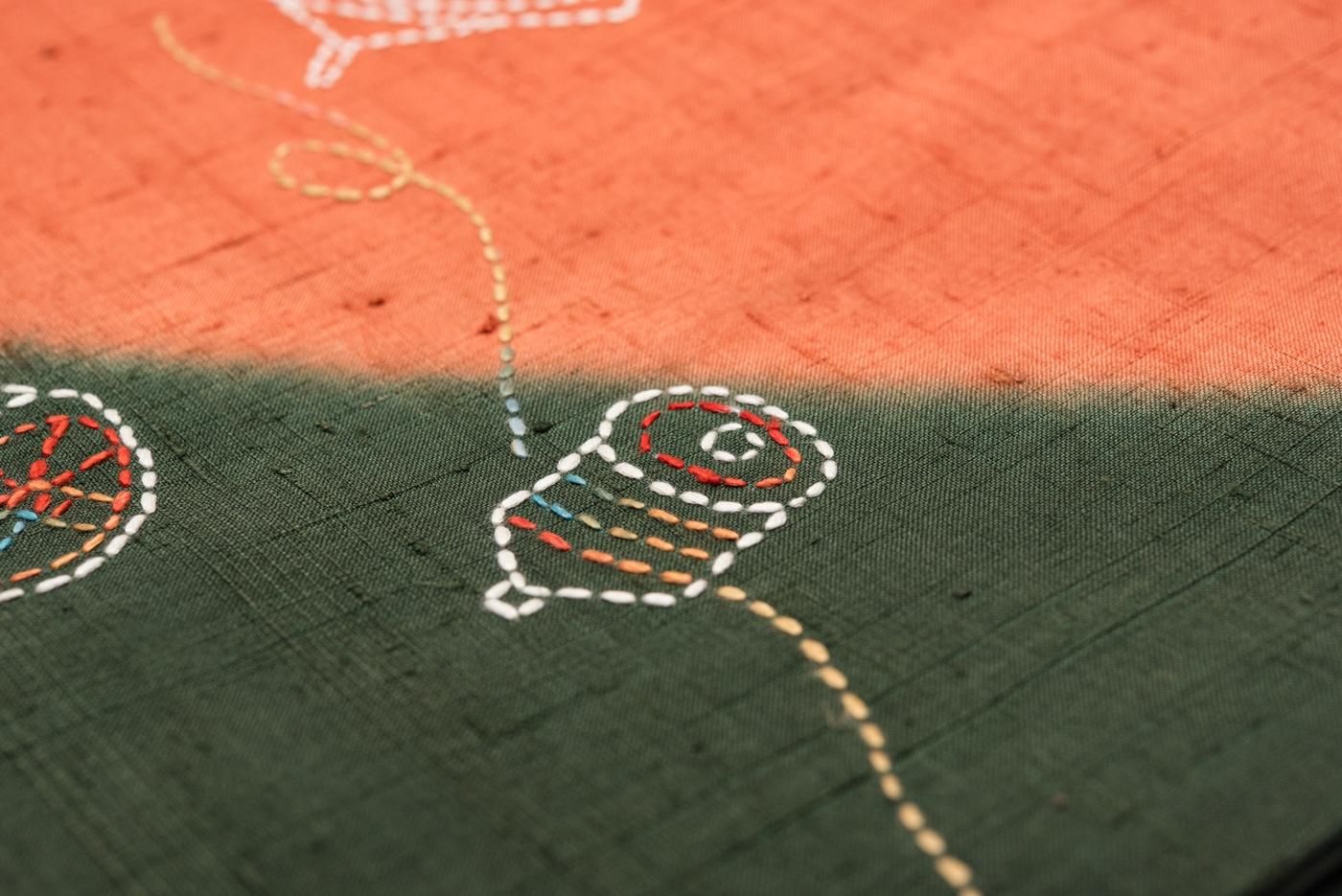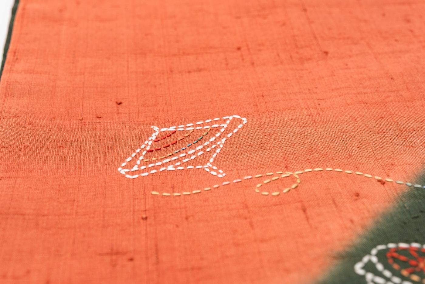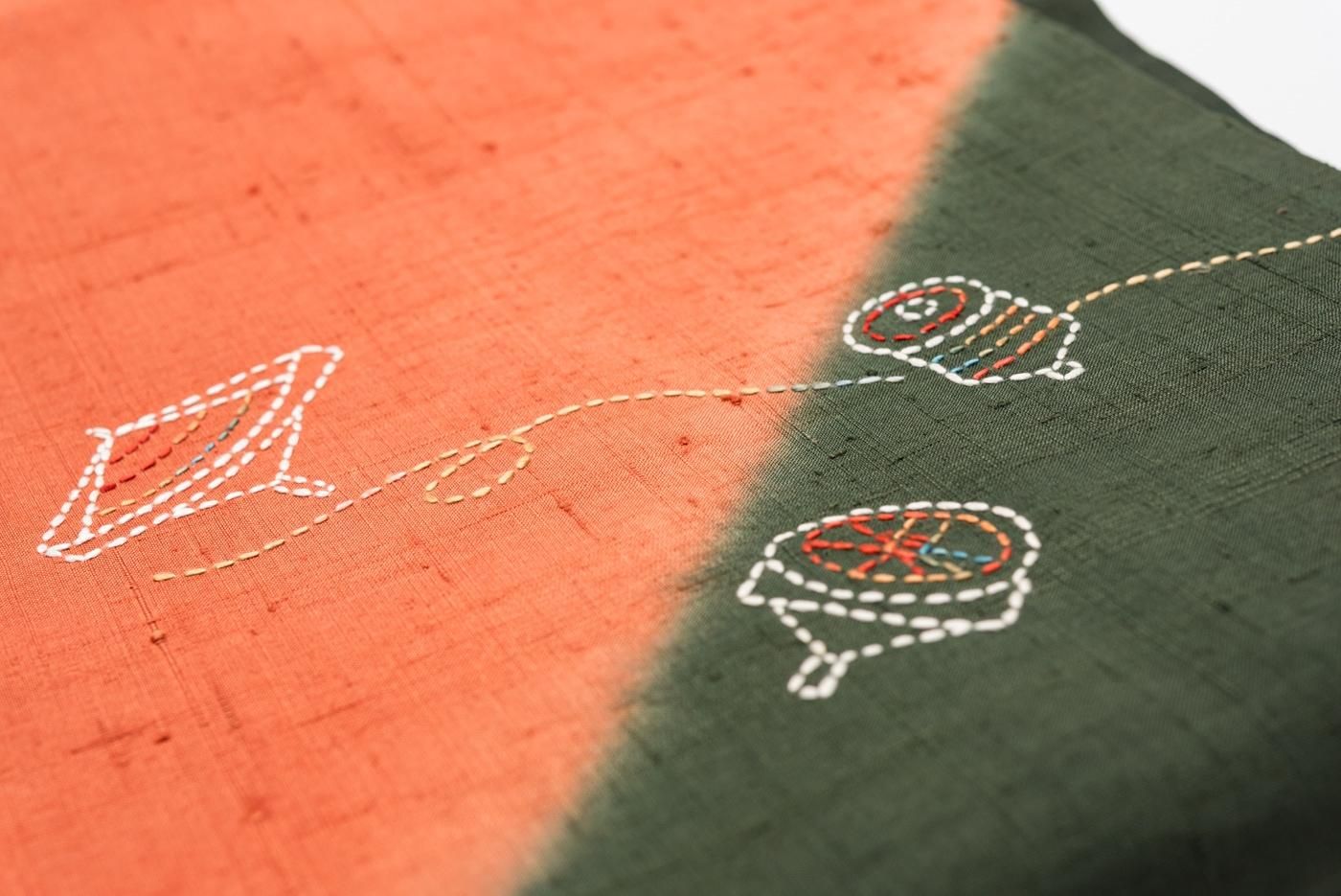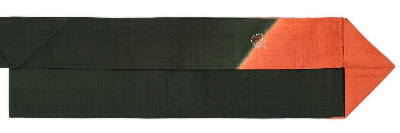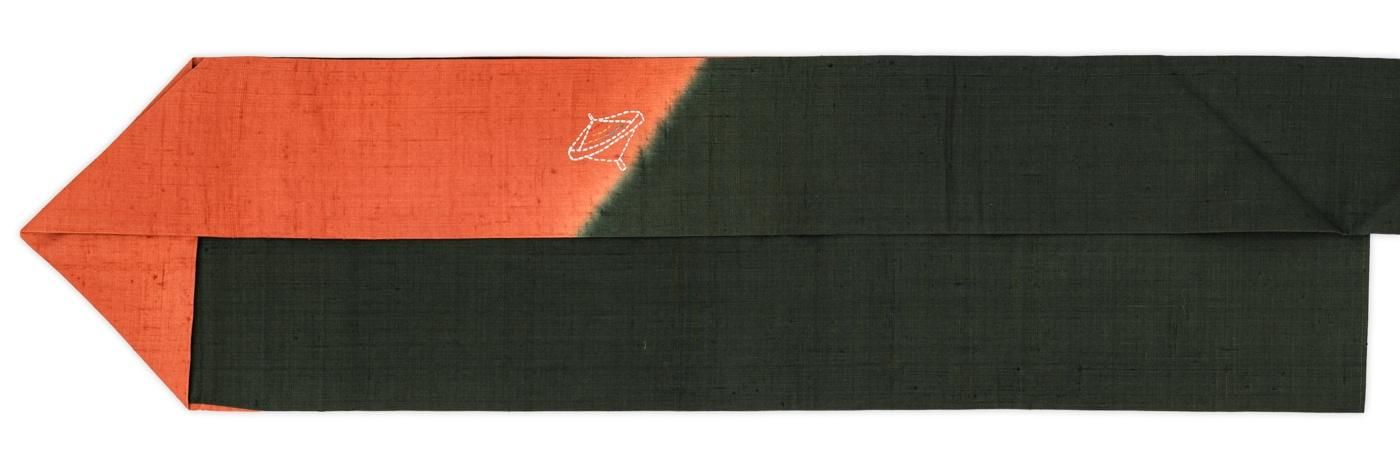 斜めの染め分けが印象的な紬地に、刺し子の独楽が踊る九寸名古屋帯です。