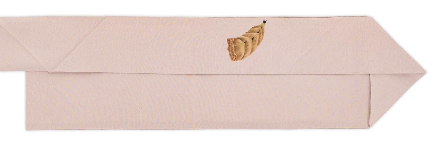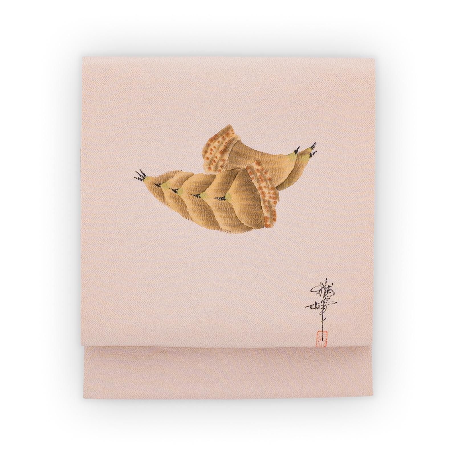 淡いピンクベージュの縮緬地に筍を描いた九寸名古屋帯です。