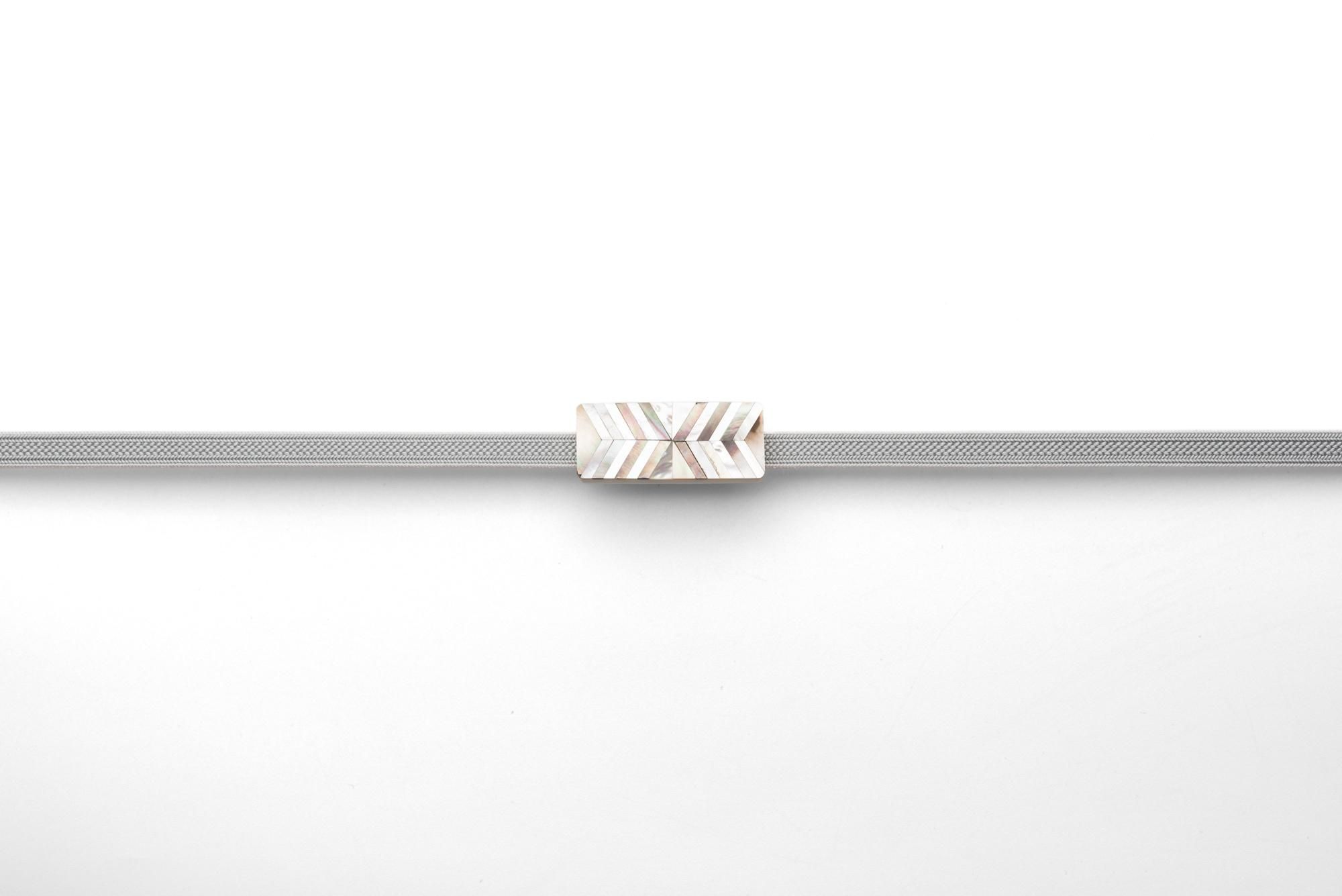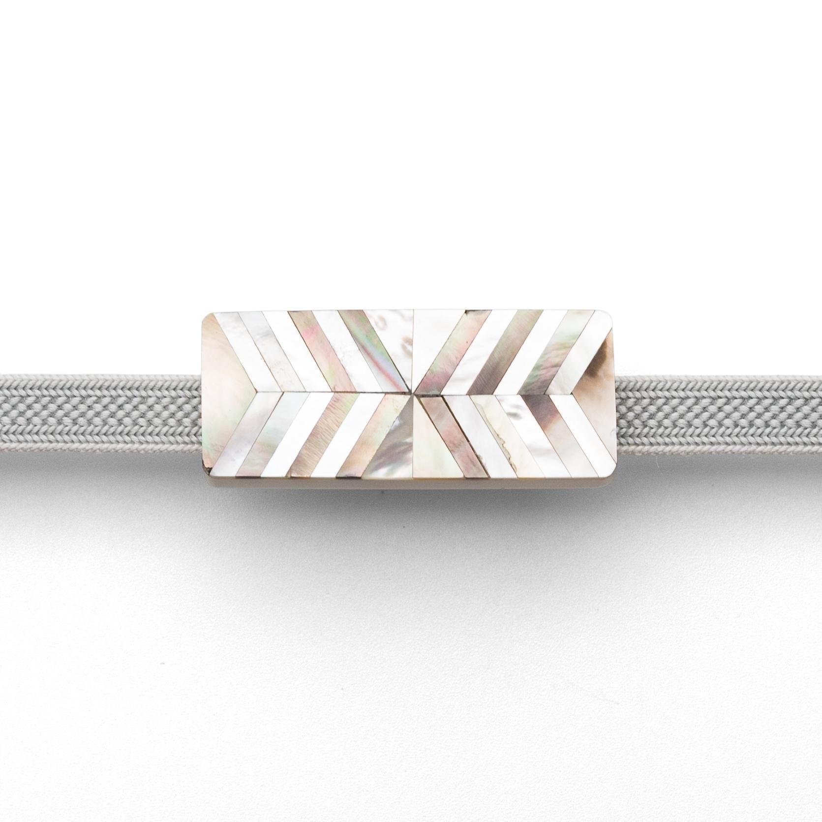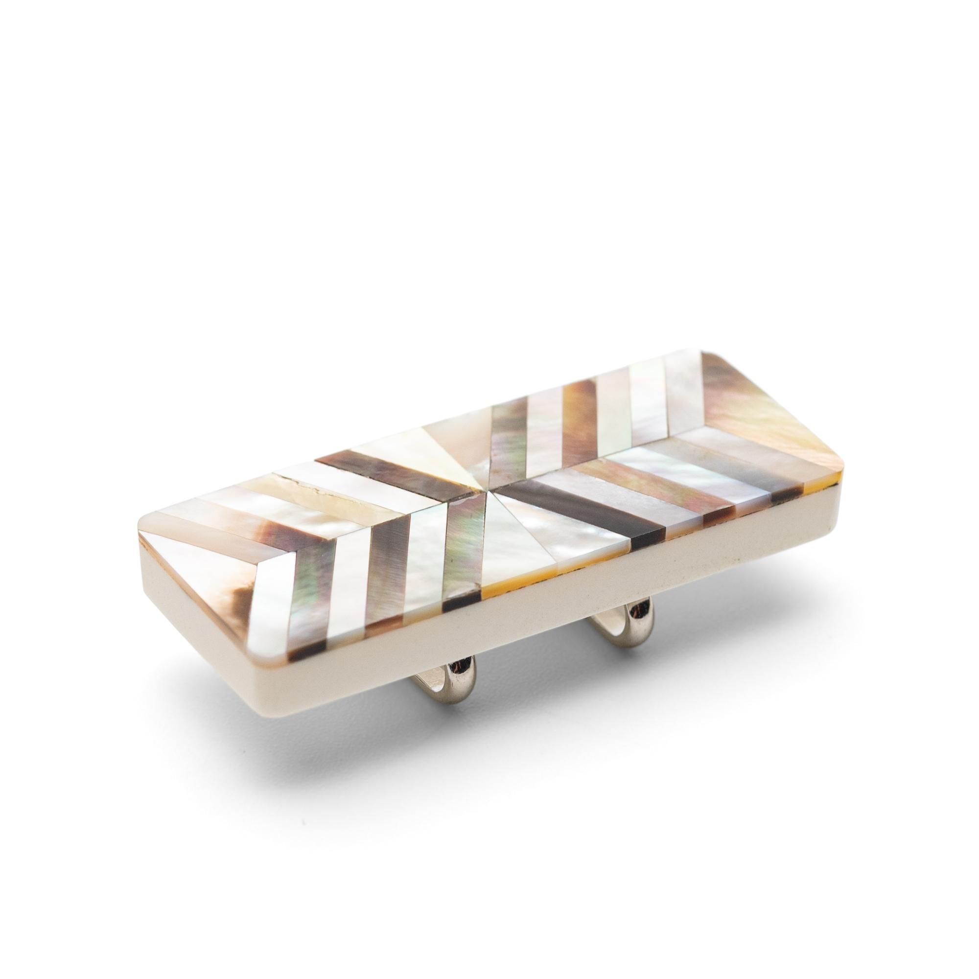 横長のフォルムにヘリンボーン模様が浮かぶ螺鈿の帯留めです。
