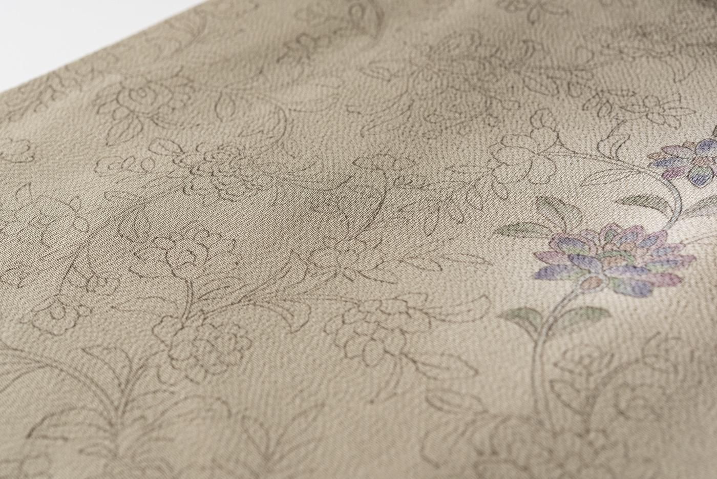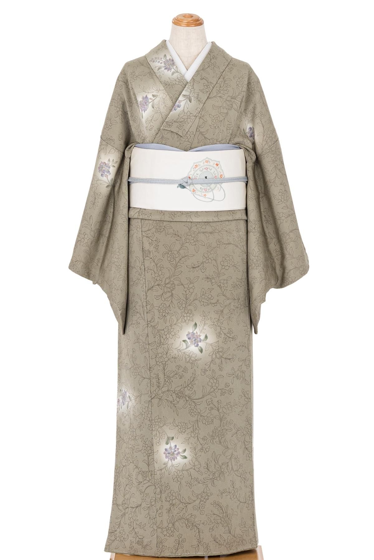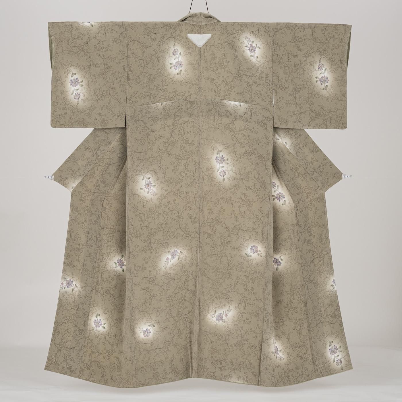 利休色の縮緬地に唐花模様を染めた一つ紋入りの小紋です。