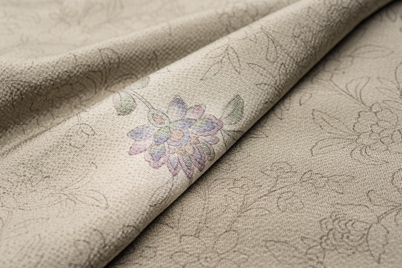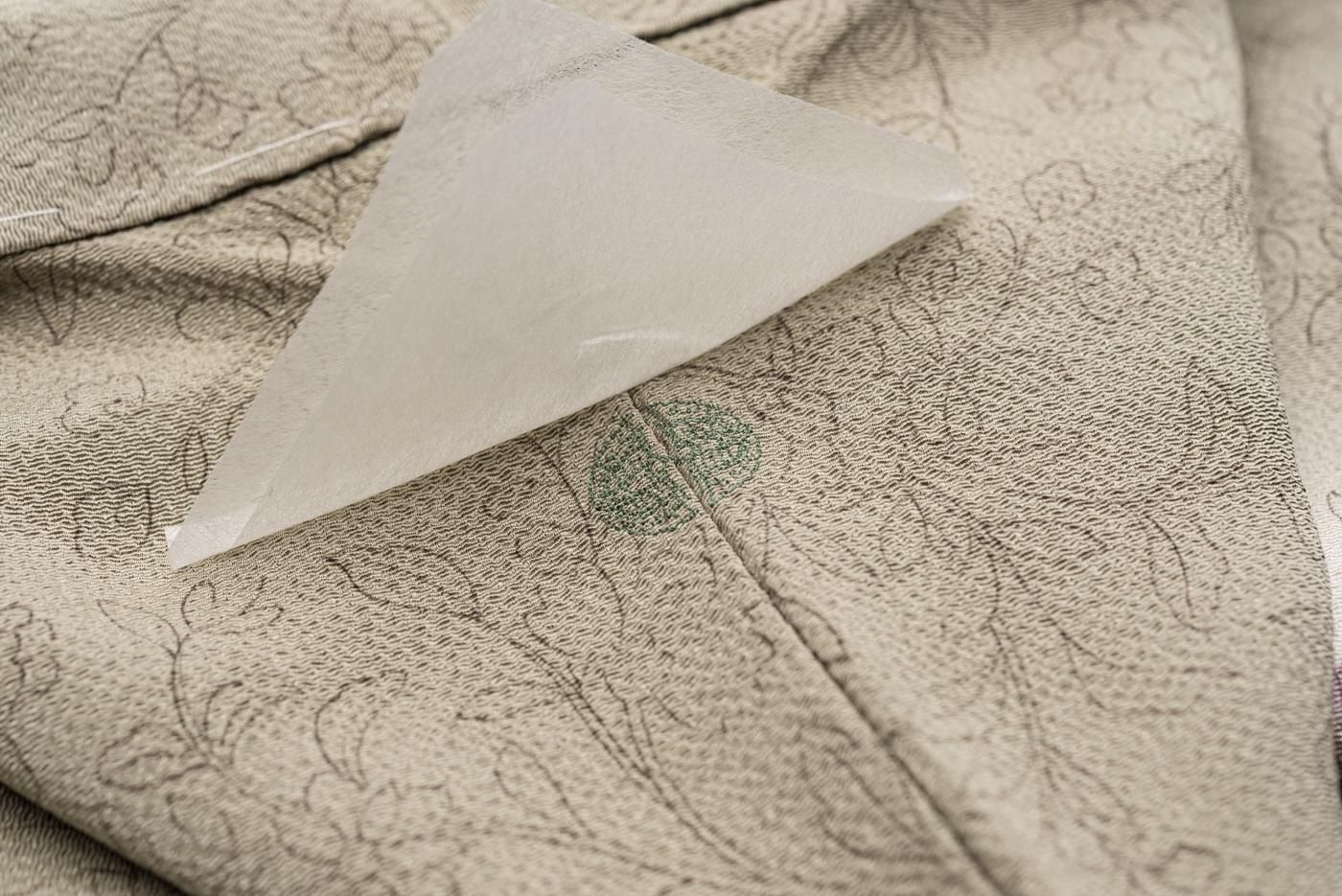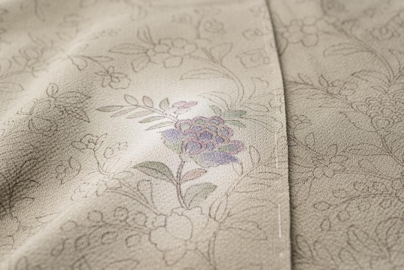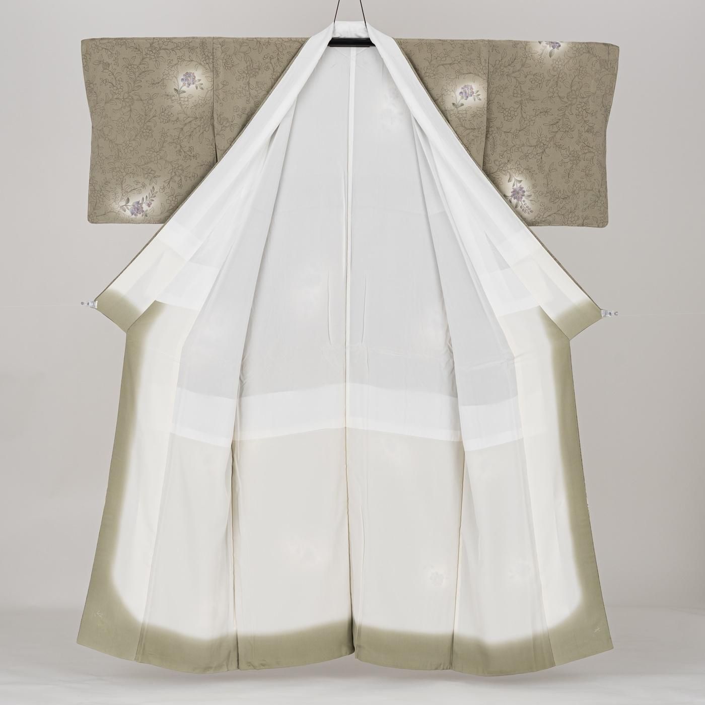 利休色の縮緬地に唐花模様を染めた一つ紋入りの小紋です。