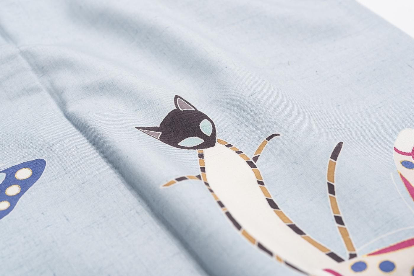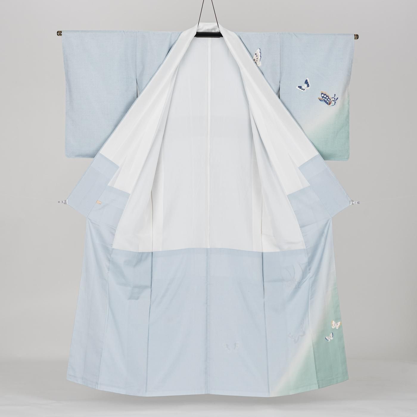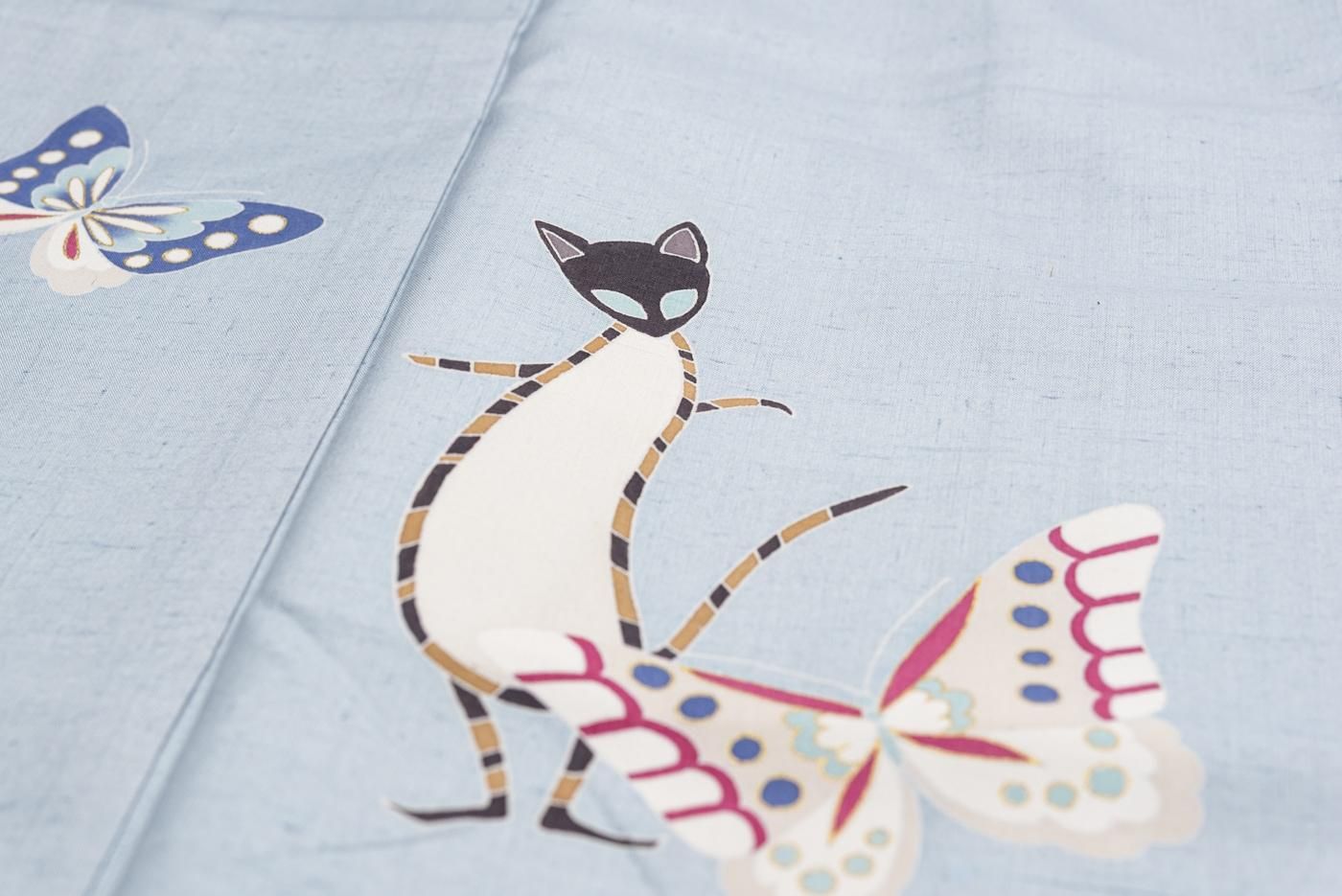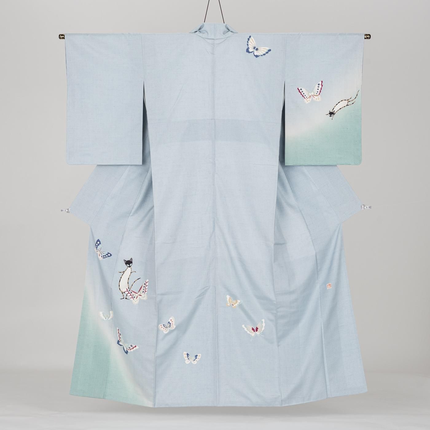水色の紬地に猫と蝶々を描いた訪問着です。