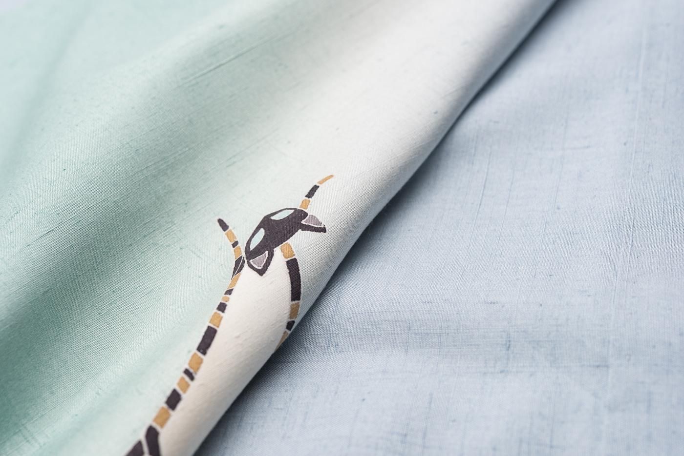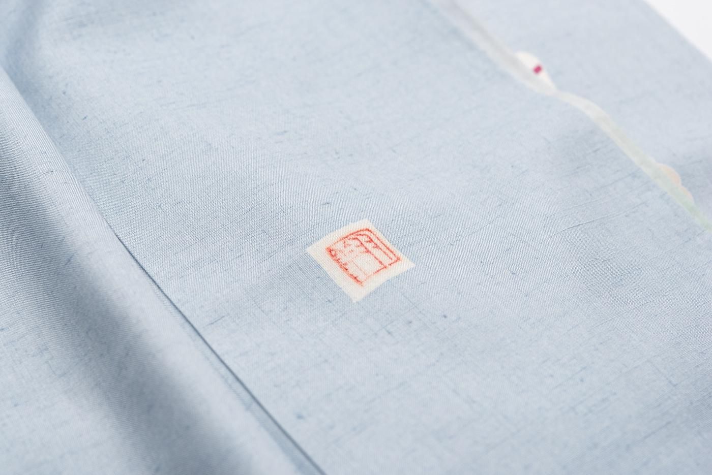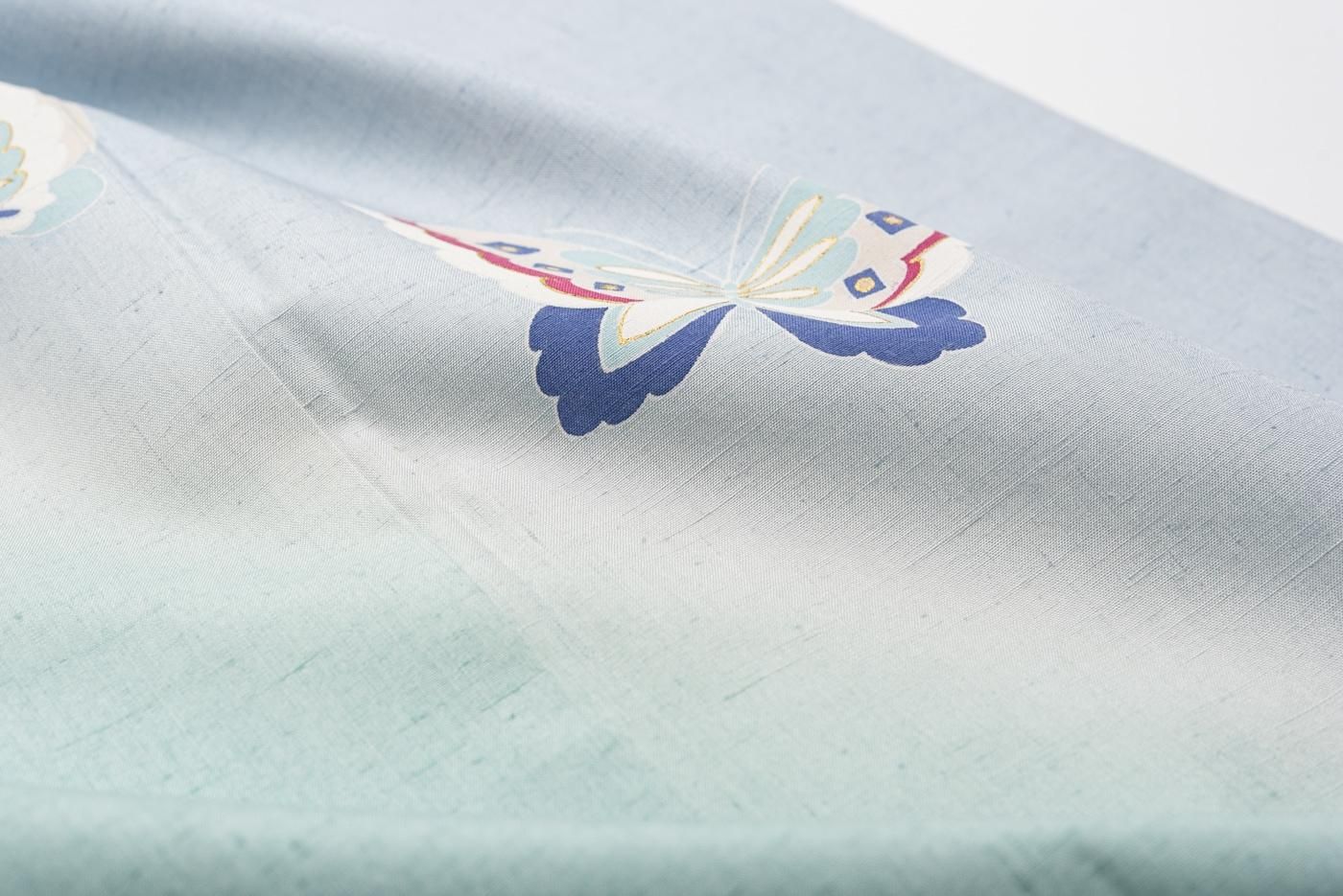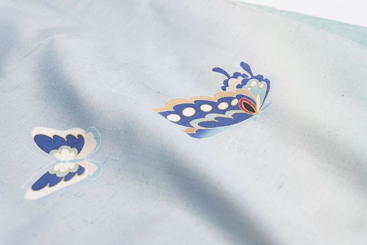 水色の紬地に猫と蝶々を描いた訪問着です。