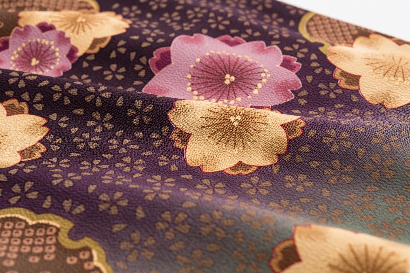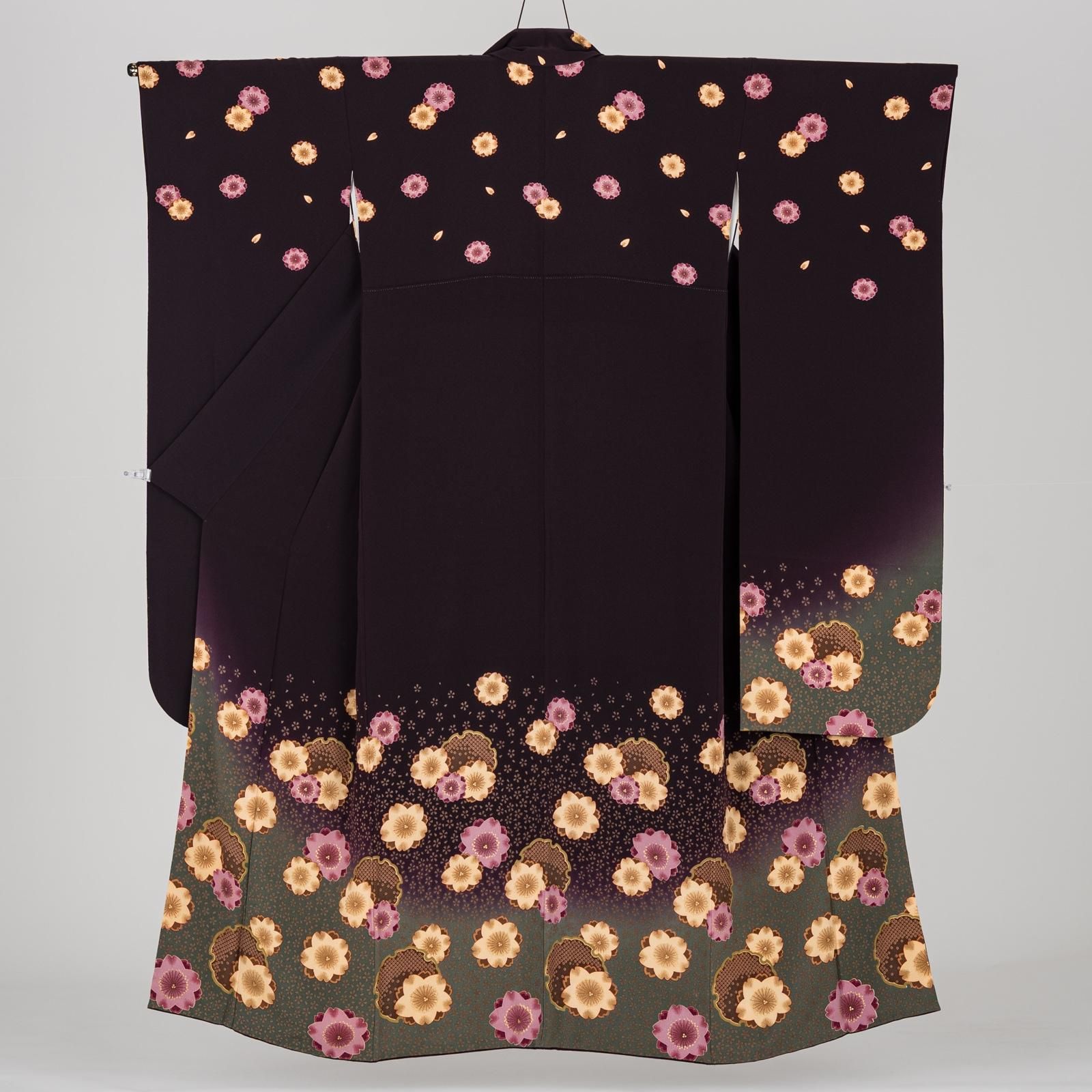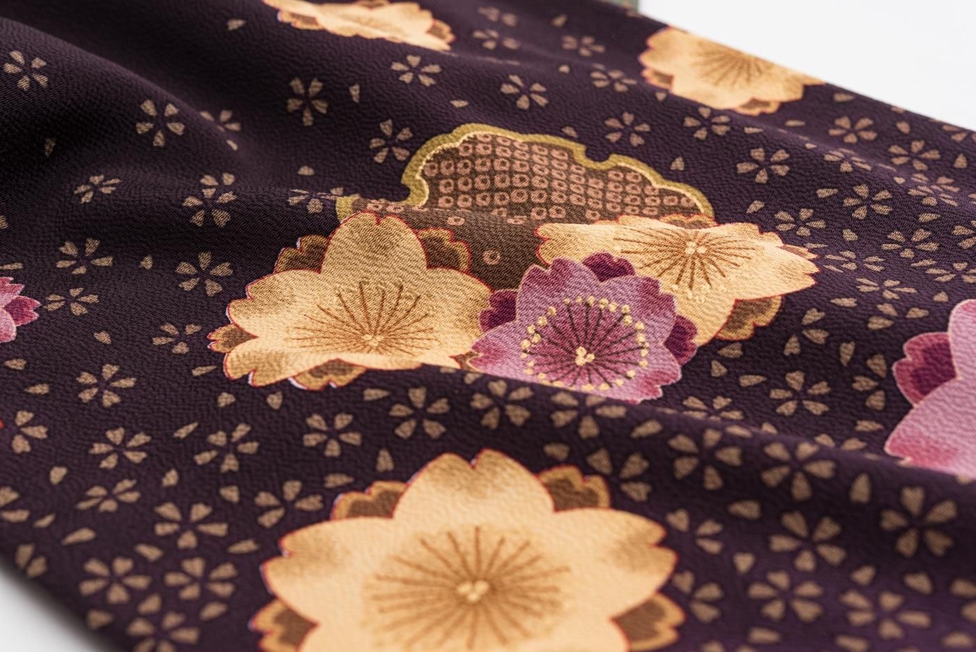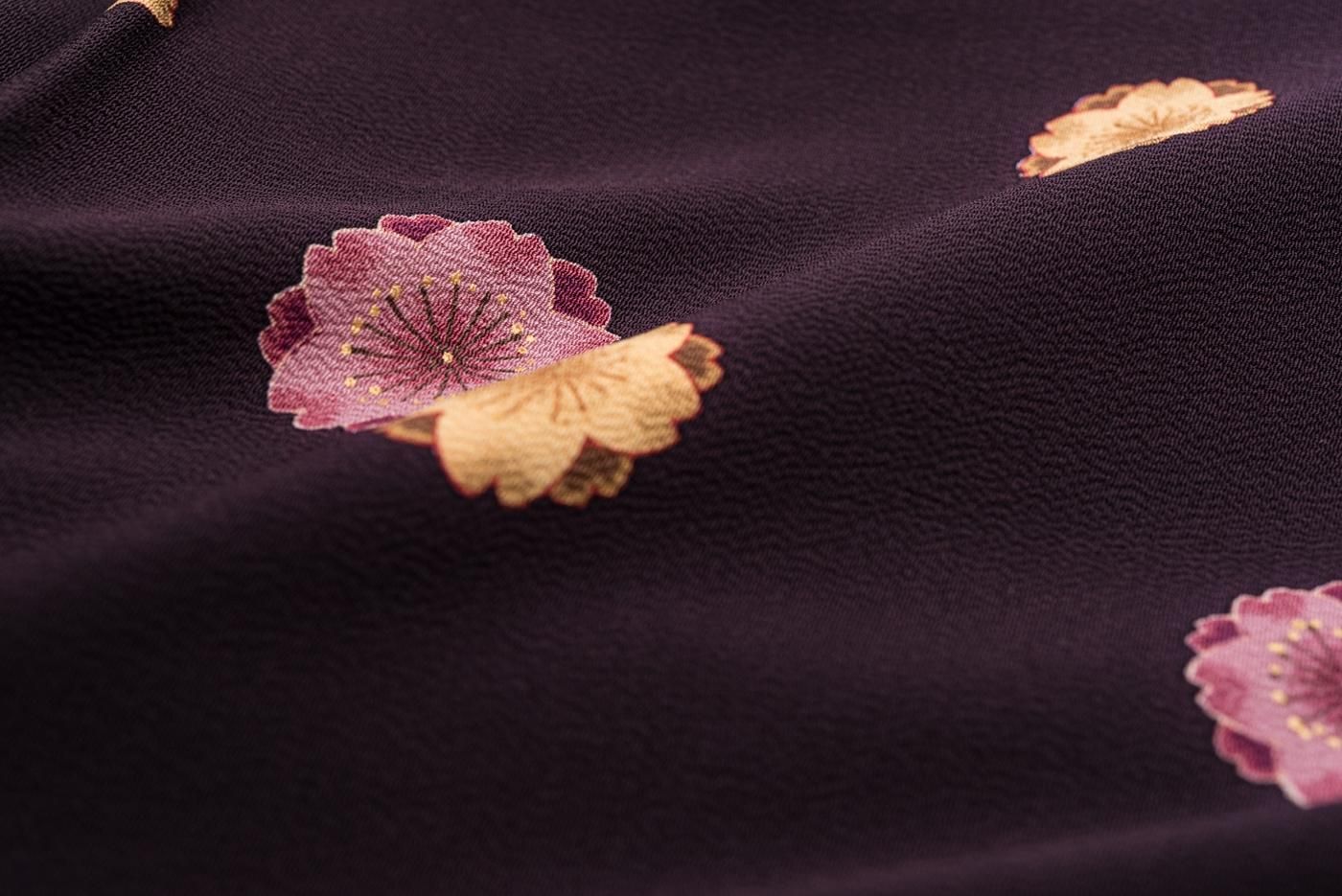 黒紫の縮緬地に雪輪と桜を描いた振袖です。