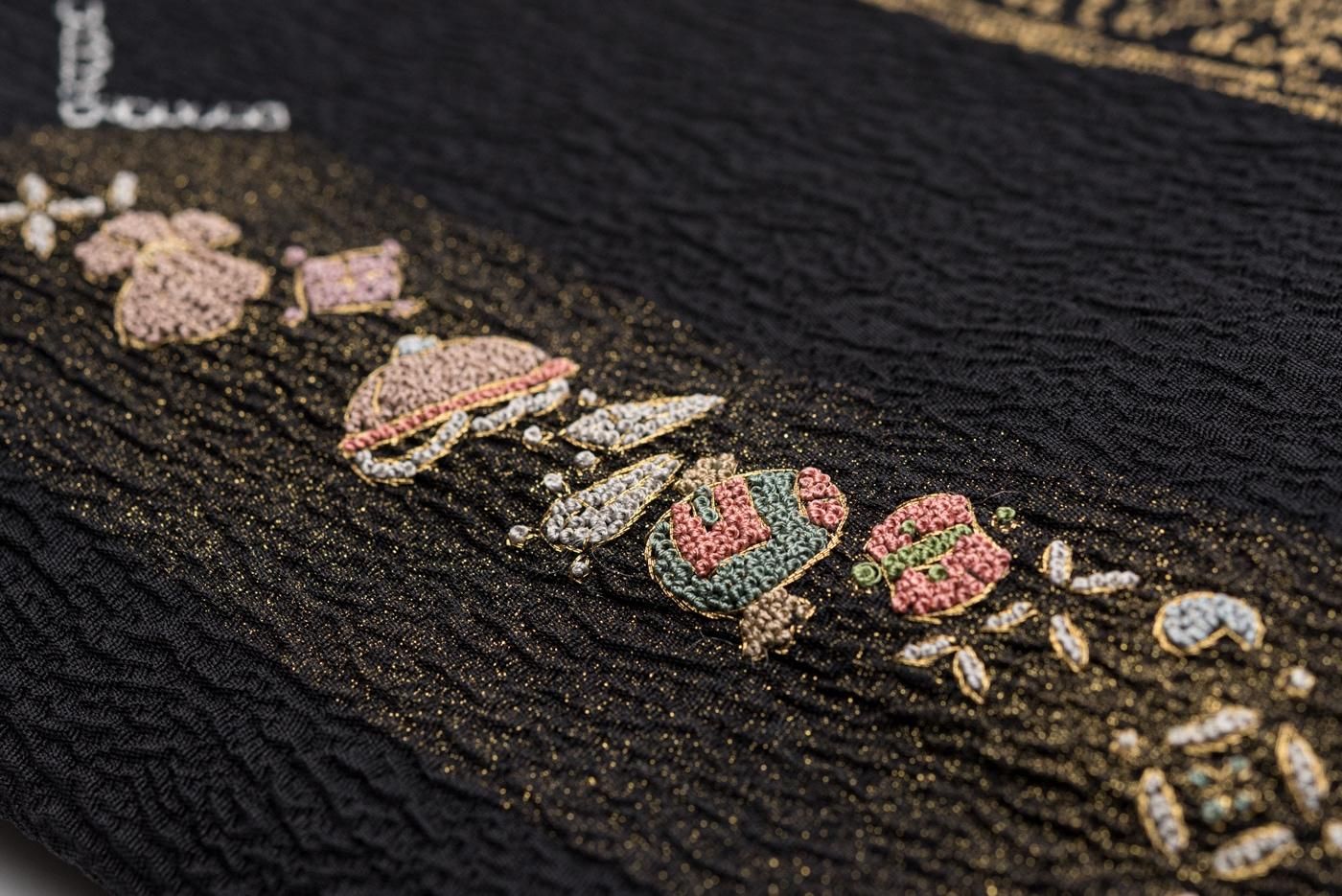 亀甲、鹿の子、斜め縞など敷き詰めた縞には相良刺繍の宝尽くし模様も添えられており大変華やかな印象です。
