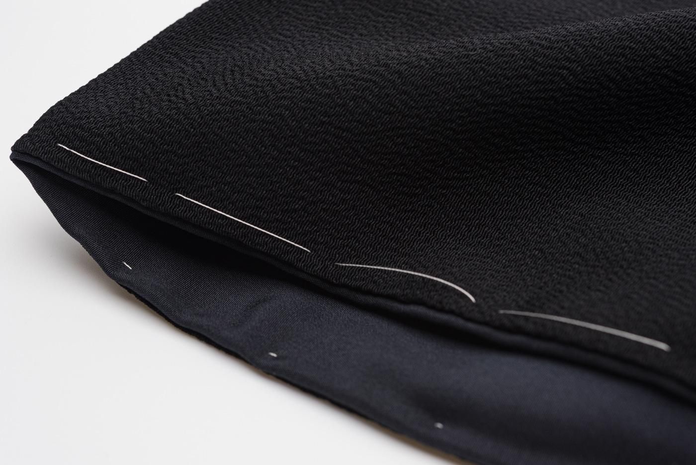 黒の縮緬地に鼓と読本模様を描いた訪問着です。
